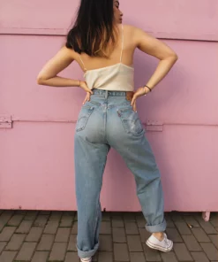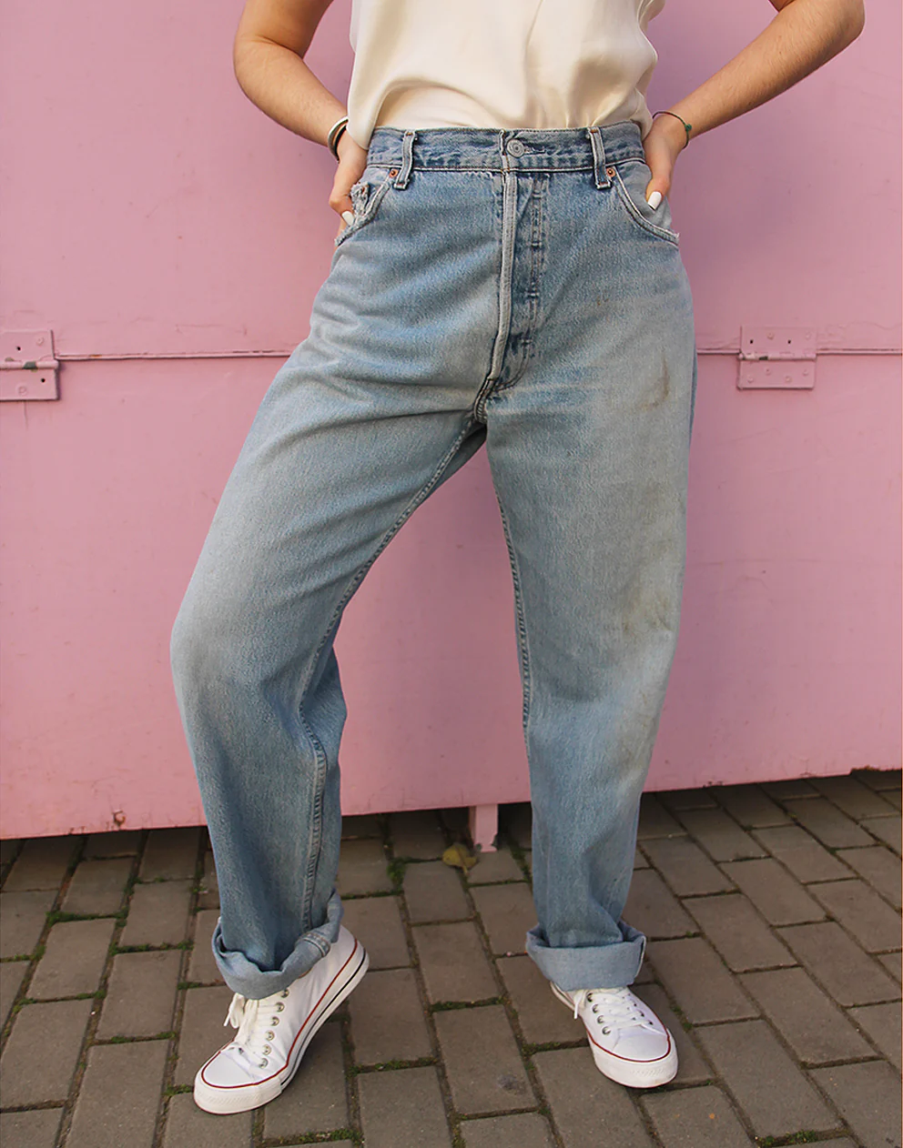 Part of our staple denim collection, original vintage Levi’s 501 Mom jeans in a pale wash blue denim.