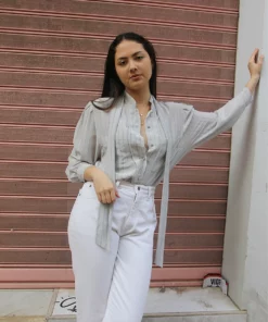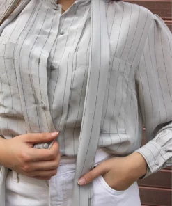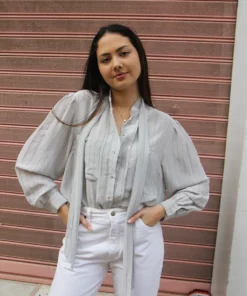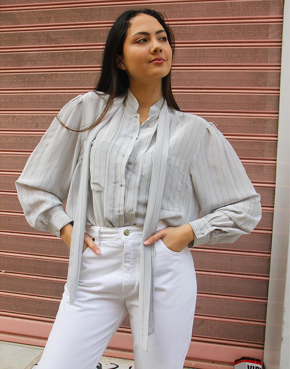 Vintage blouse in a pale grey colour with fine vertical pinstripe.