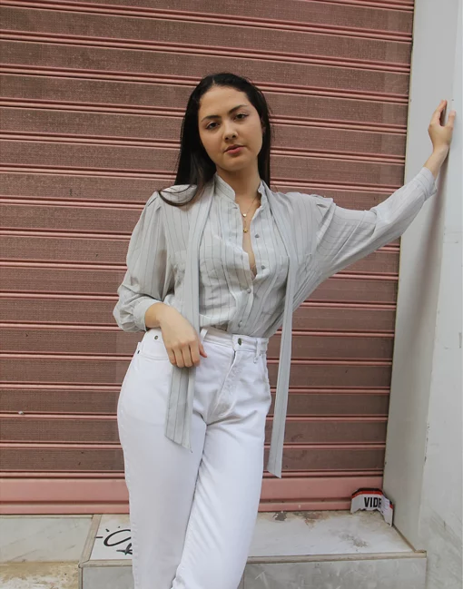 Vintage blouse in a pale grey colour with fine vertical pinstripe.