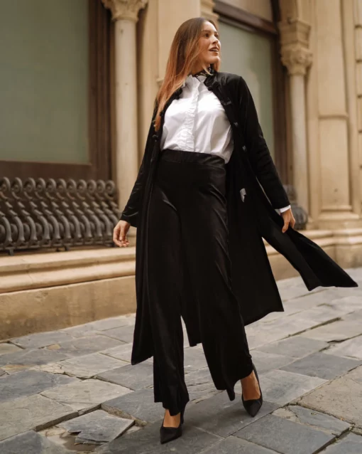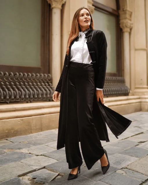 - Pantalón fluido ligeramente acampanado y tiro alto.