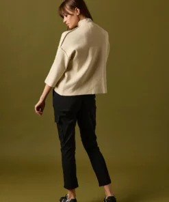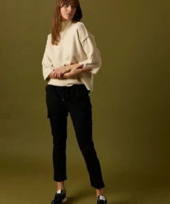 Pantalón largo estilo cargo en color negro. Tiro medio, cintura elástica ajustable con cordón y detalle de bolsillos laterales.