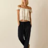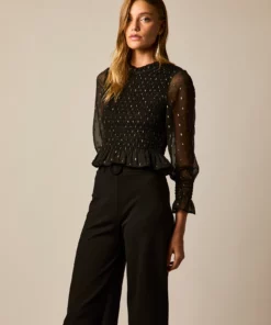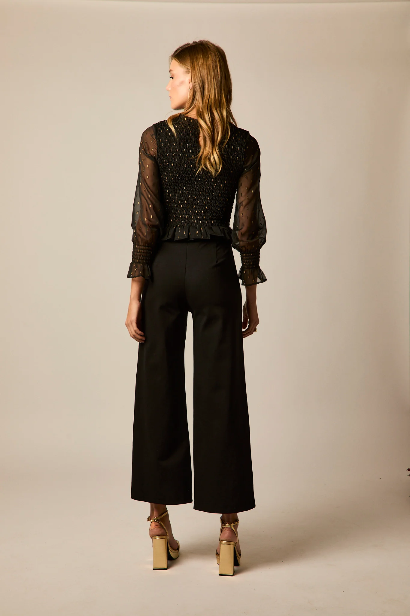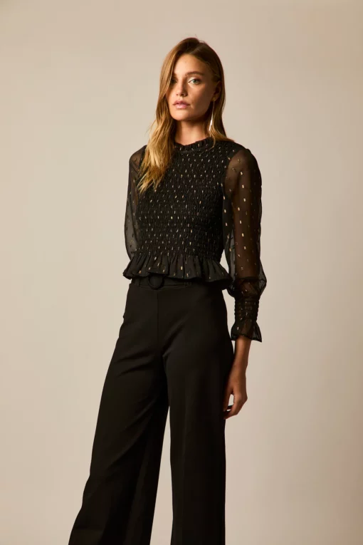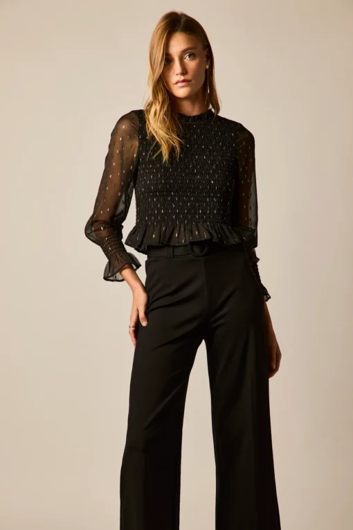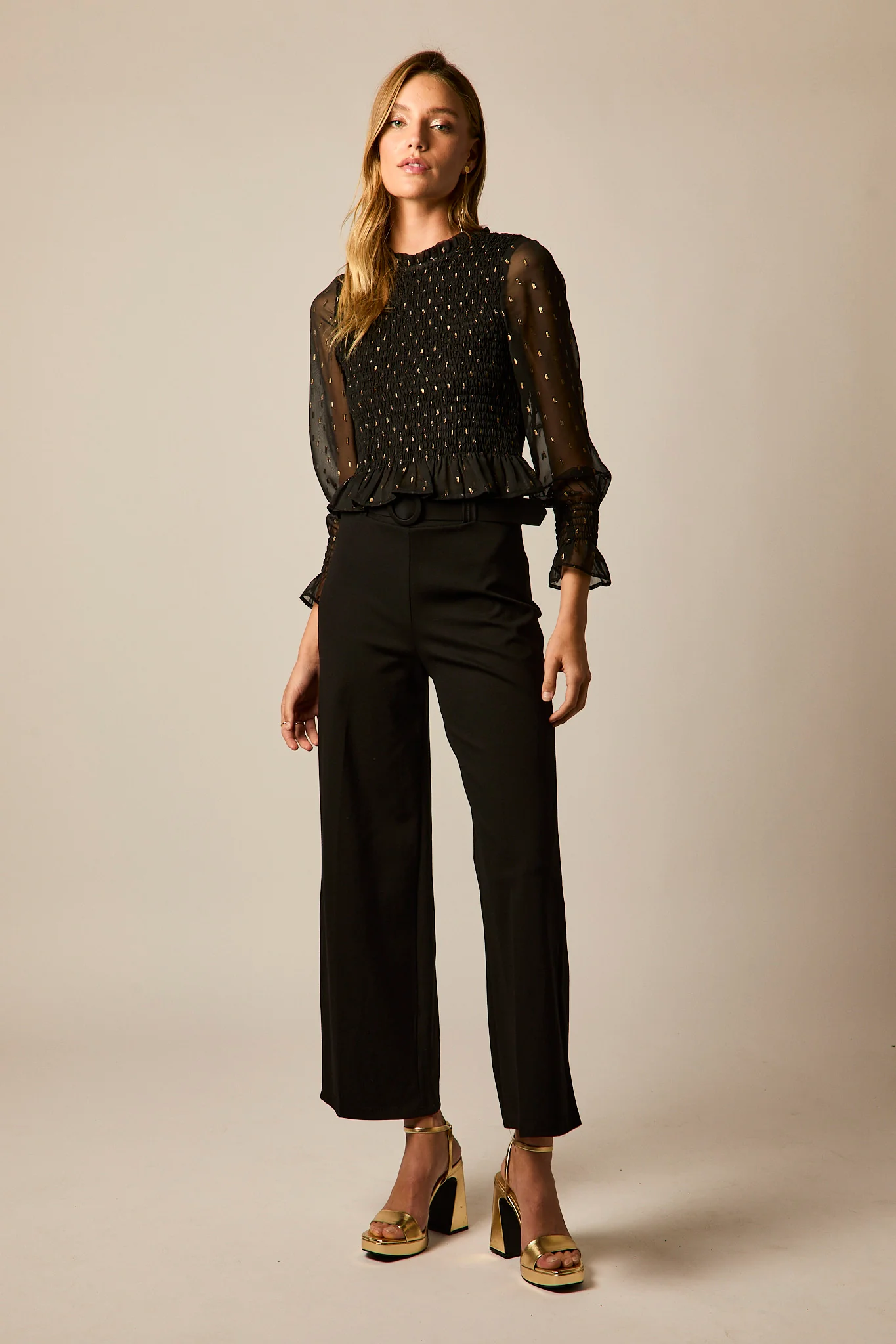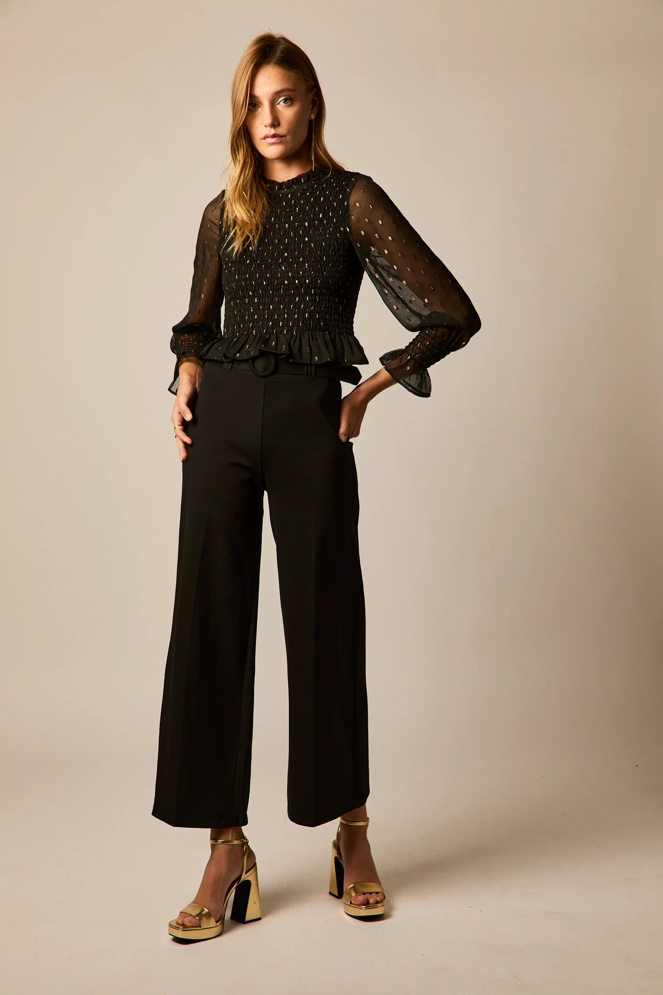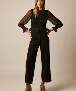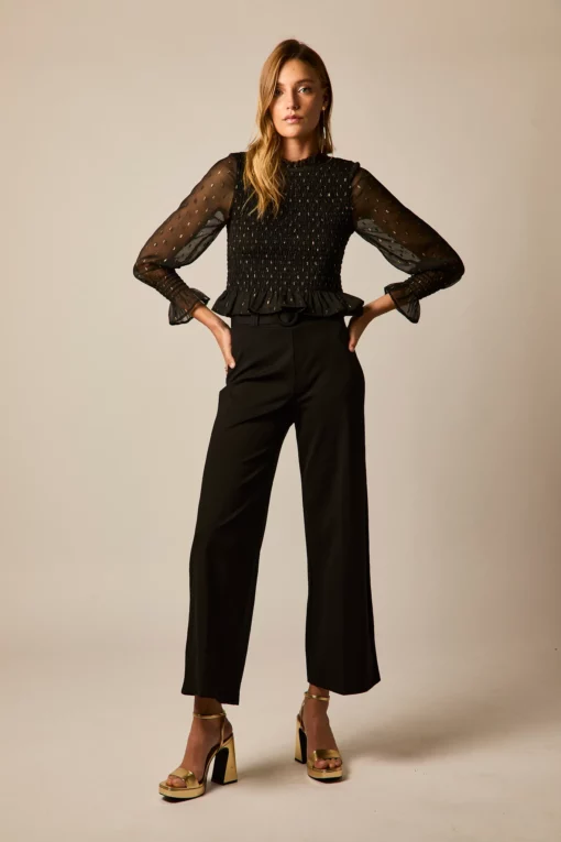 Pantalón recto en color negro. Tiro alto, diseño recto y acampanado en el bajo y cinturón en el mismo color.