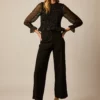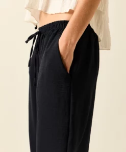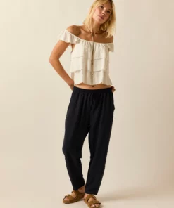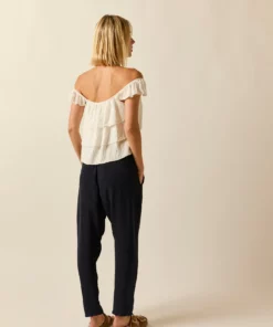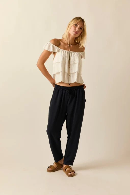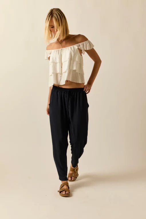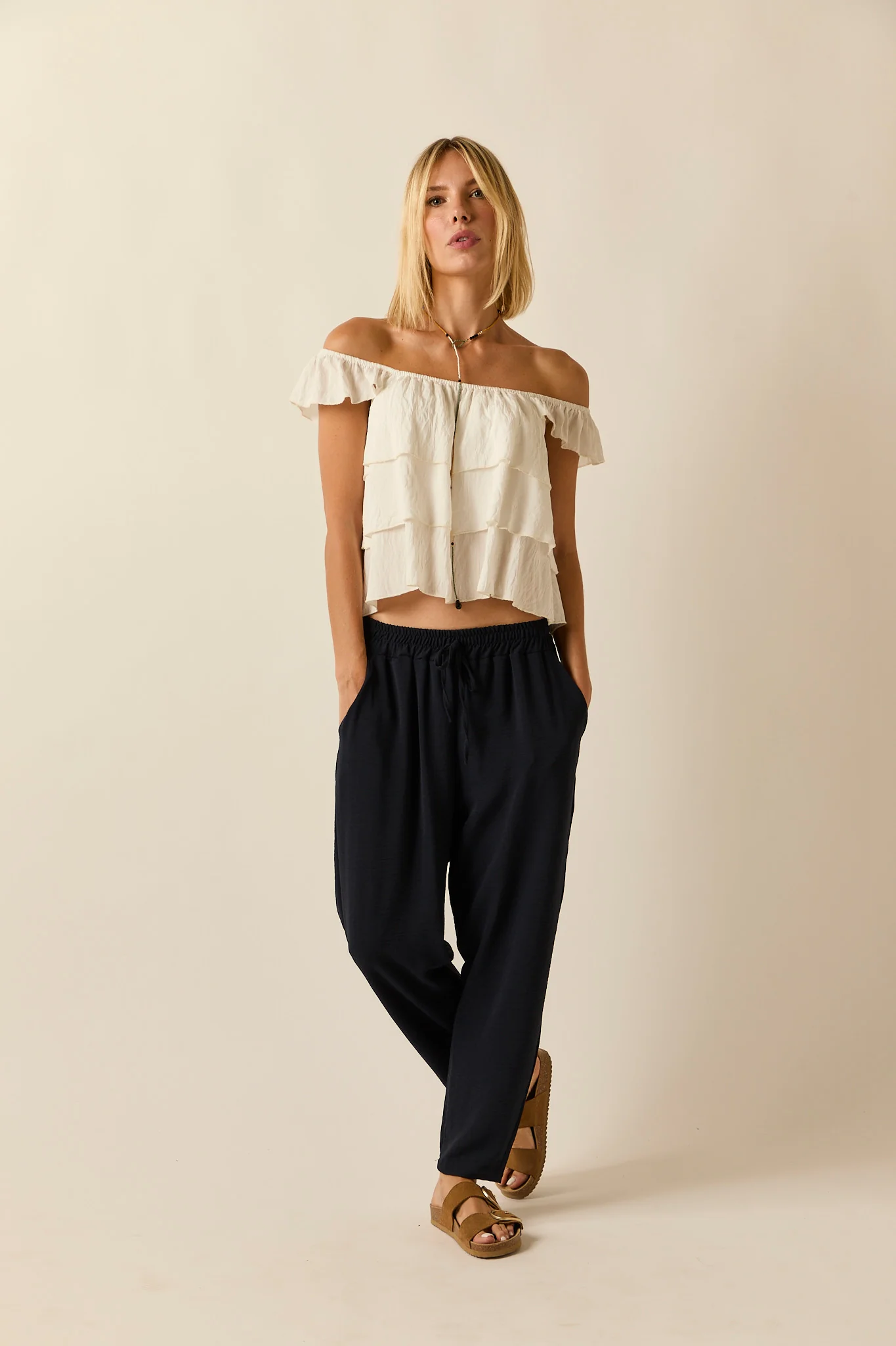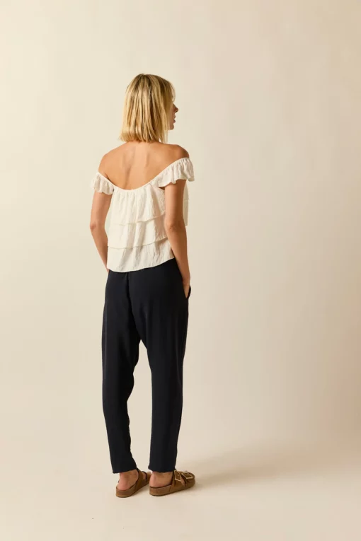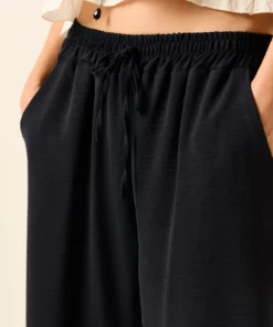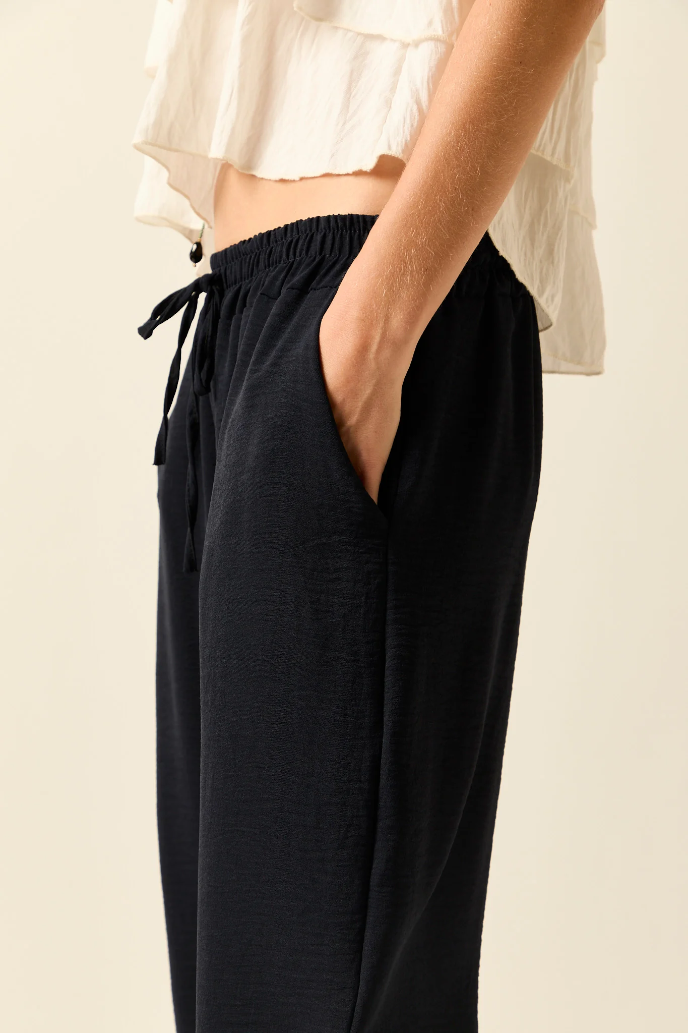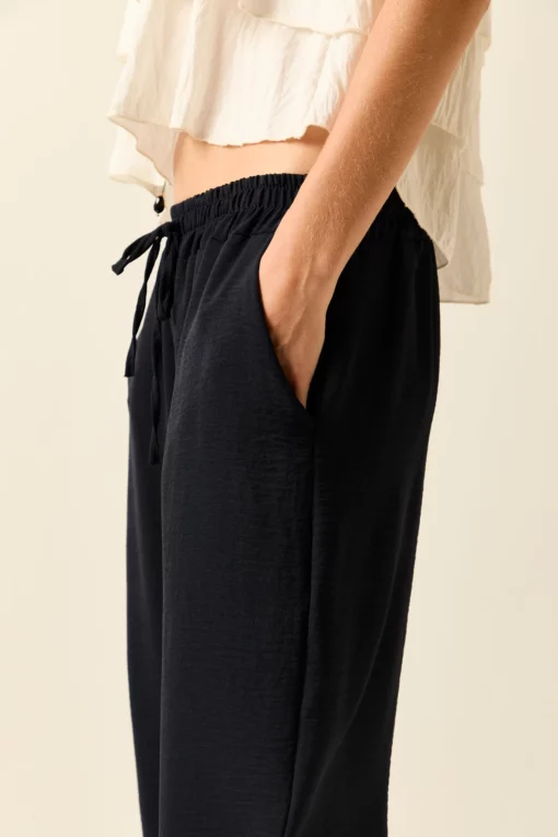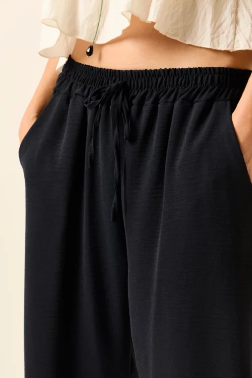 Pantalón largo de diseño fluido en color azul marino. Tiro alto, cintura elástica con detalle de lazo y bolsillos laterales.