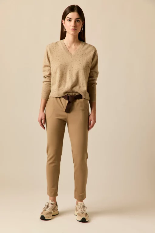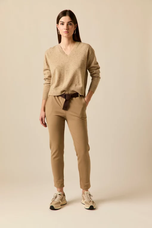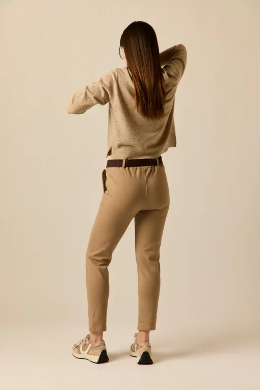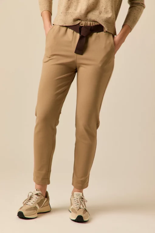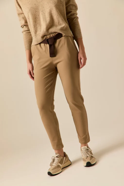 Pantalón jogger en color camel. Tiro medio, estilo recto, bolsillos laterales y cierre de cremallera y botón con cinturón en color marrón. Estos pantalones suelen tallar menos de lo habitual por lo que te recomendamos coger una talla más de la que uses habitualmente.
