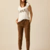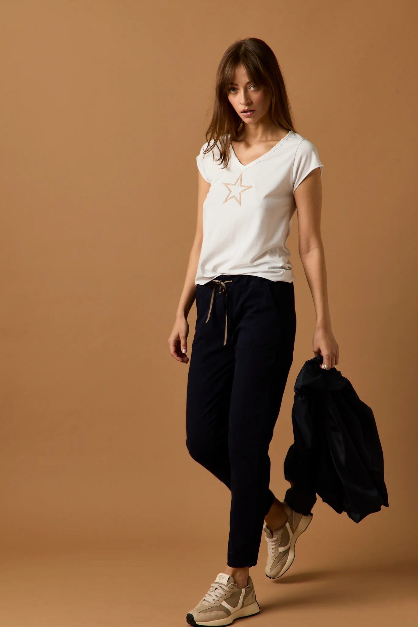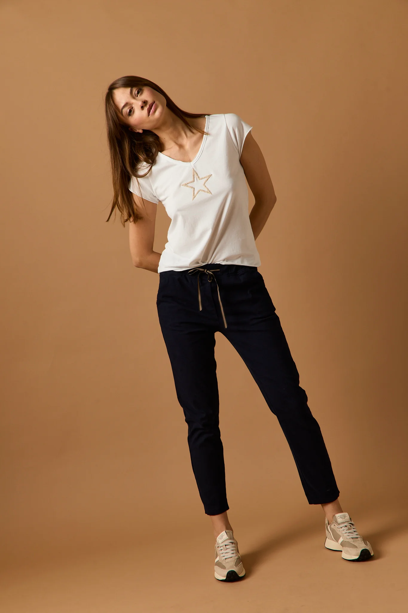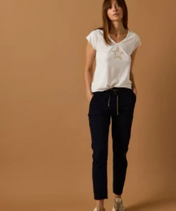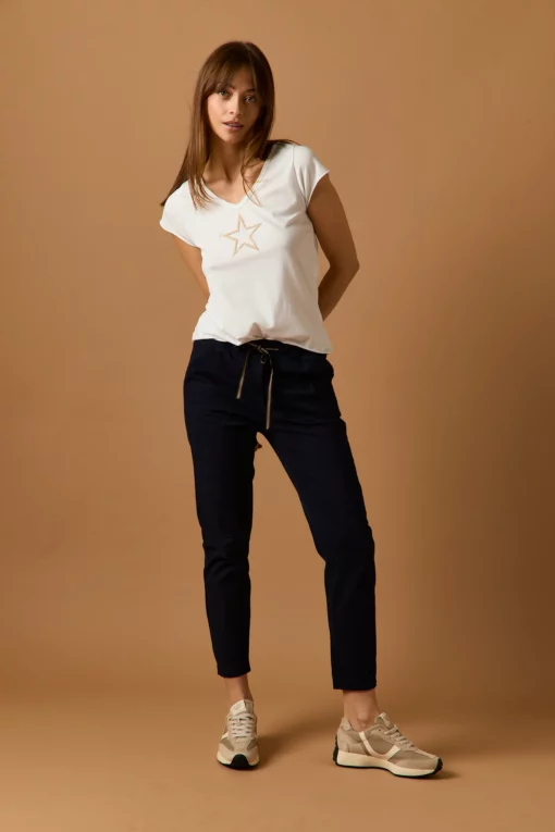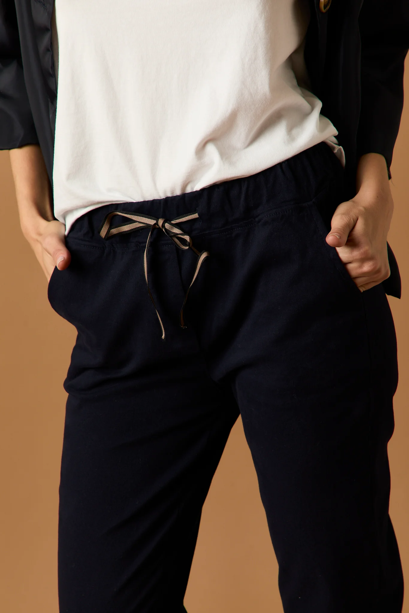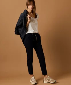 Pantalón largo en color azul marino. Tiro medio, cintura elástica ajustable con cordón de rayas y diseño recto.