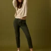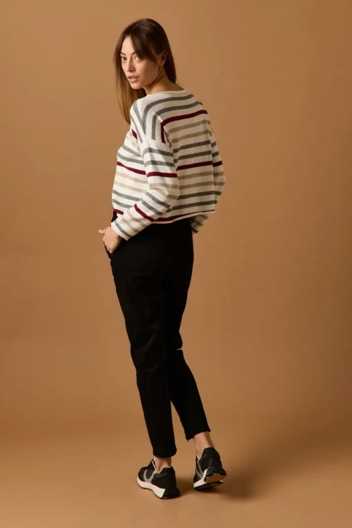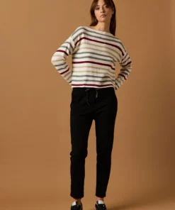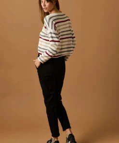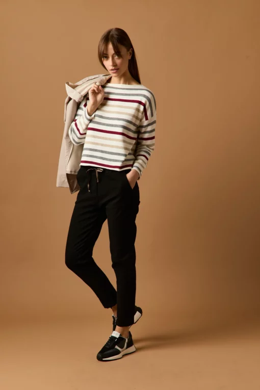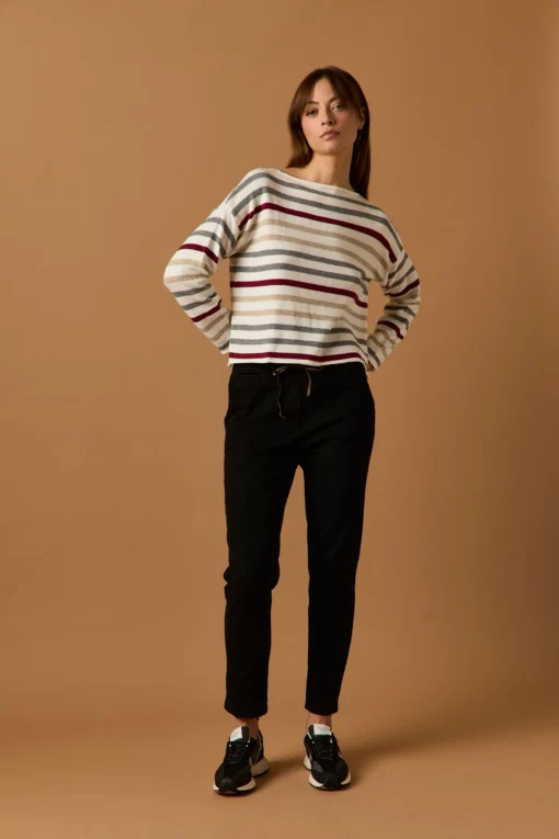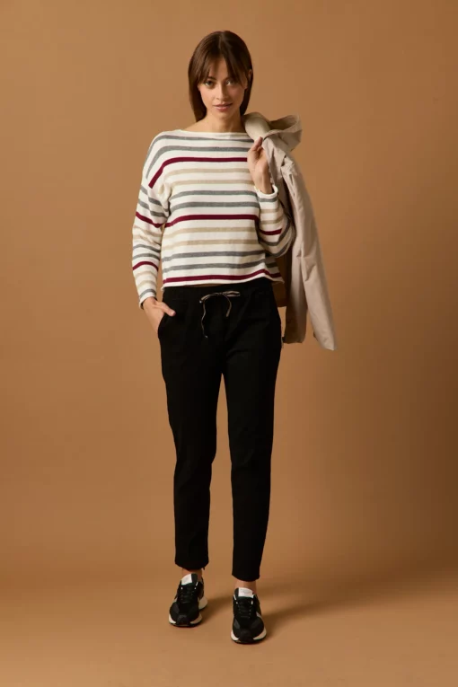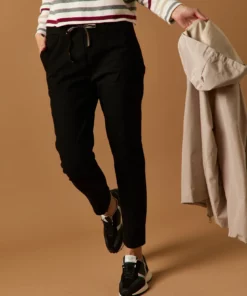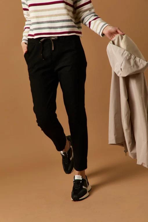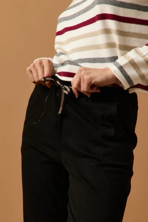 Pantalón largo en color negro. Tiro medio, cintura elástica ajustable con cordón de rayas y diseño recto.