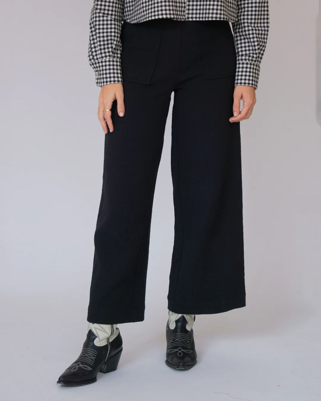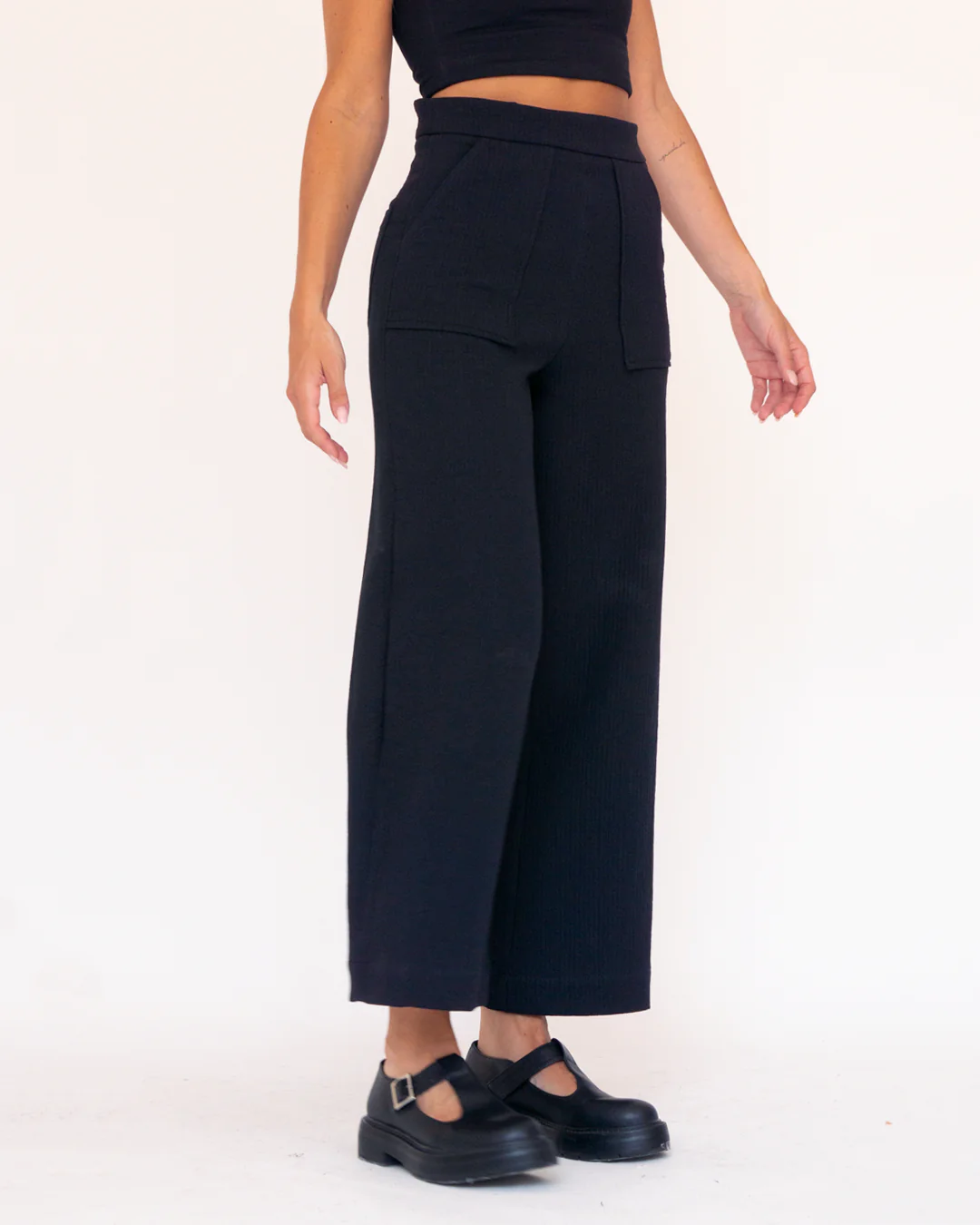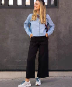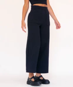 Pantalón con pernera ancha. Pespuntes y cremallera lateral.