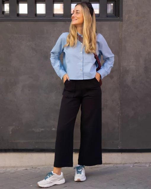 Pantalón con pernera ancha. Pespuntes y cremallera lateral.