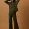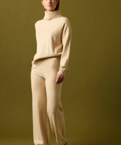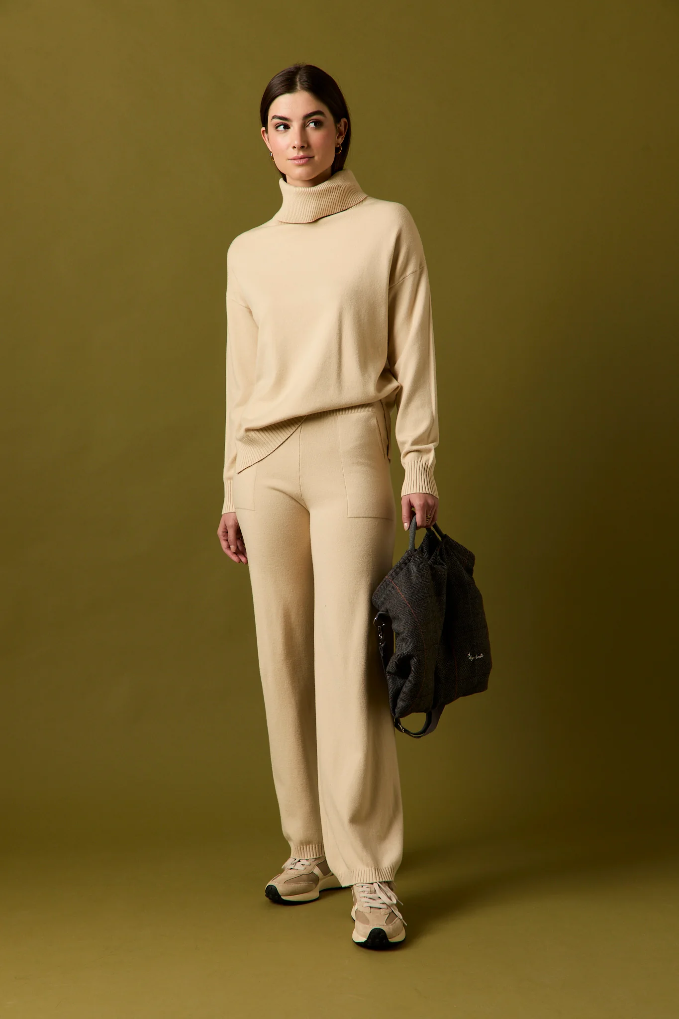 Pantalón de punto en color crema. Tiro alto, cintura elástica y diseño recto.