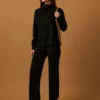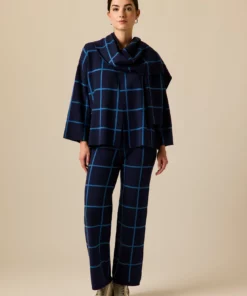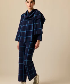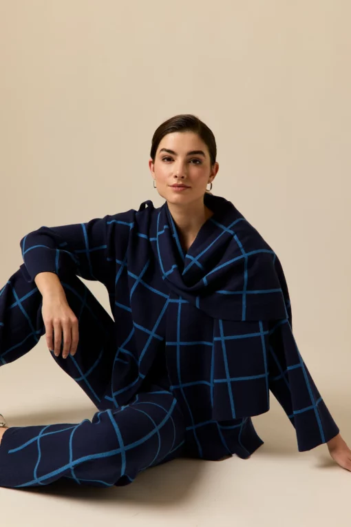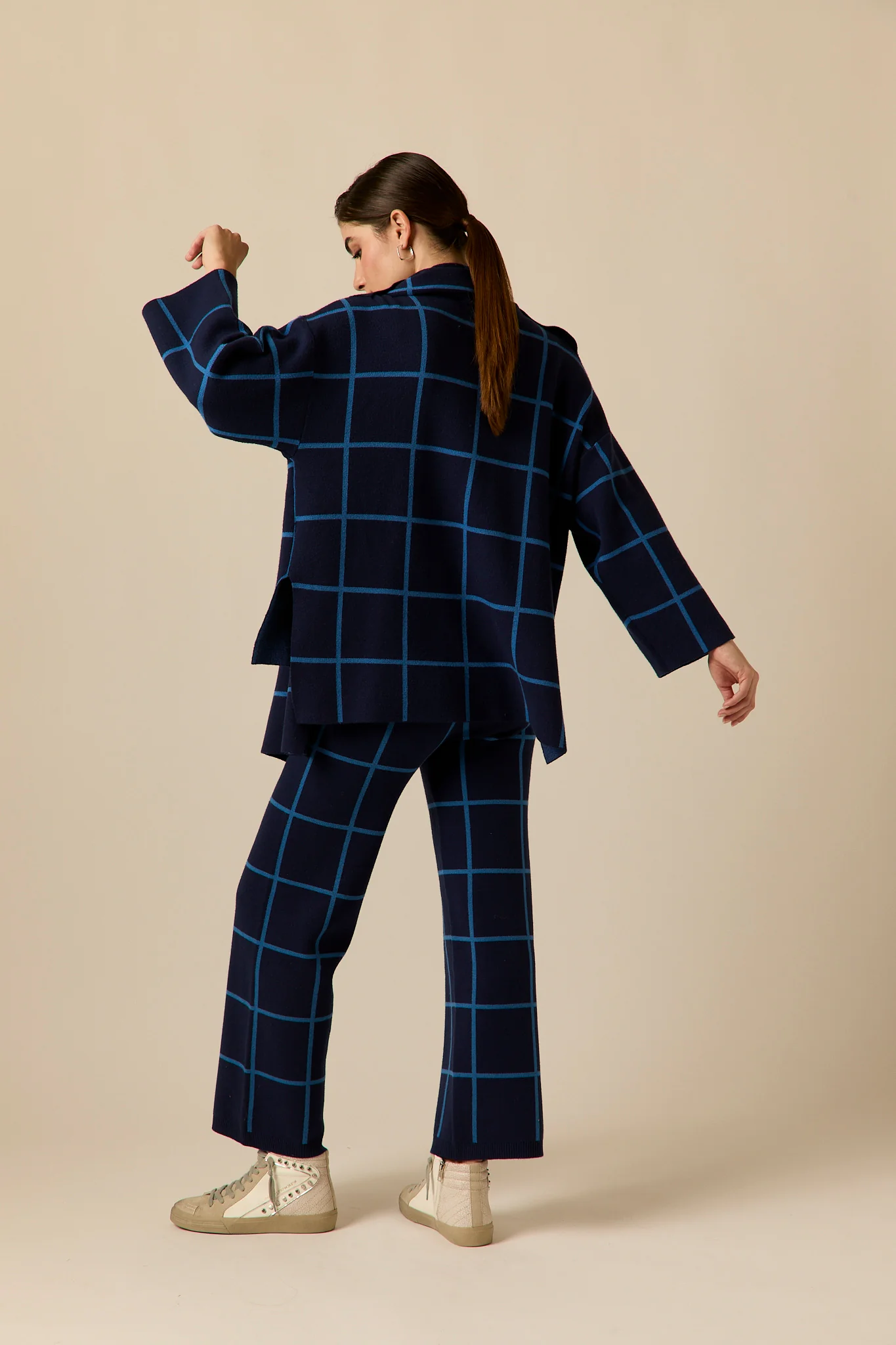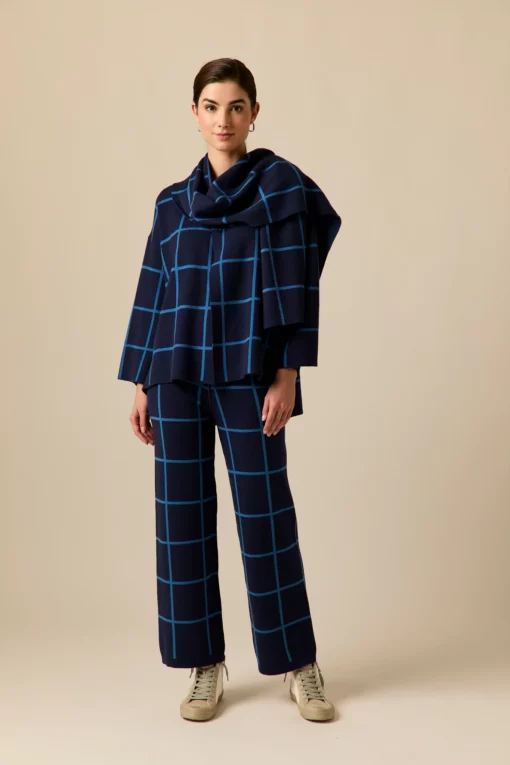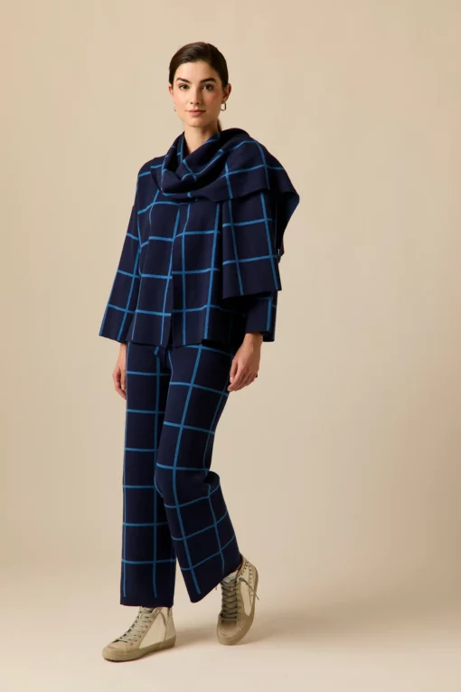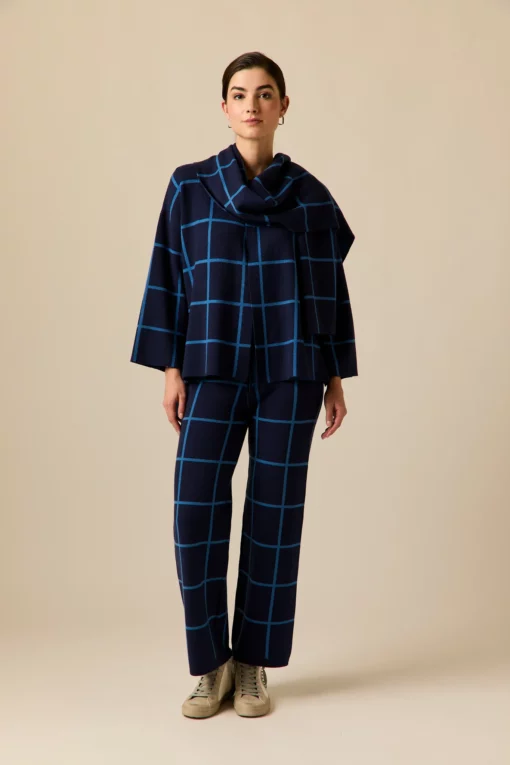 Pantalón punto jacquard en color azul marino. Tiro alto, cintura elástica, diseño recto y pierna ancha.