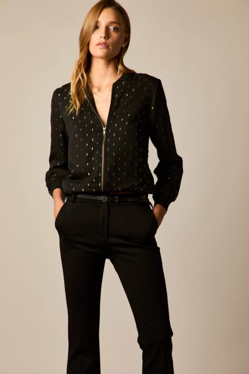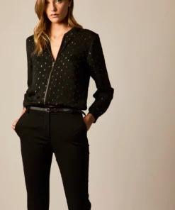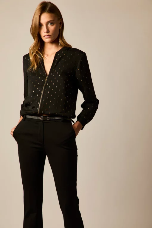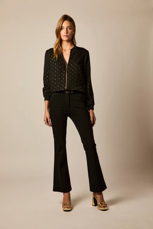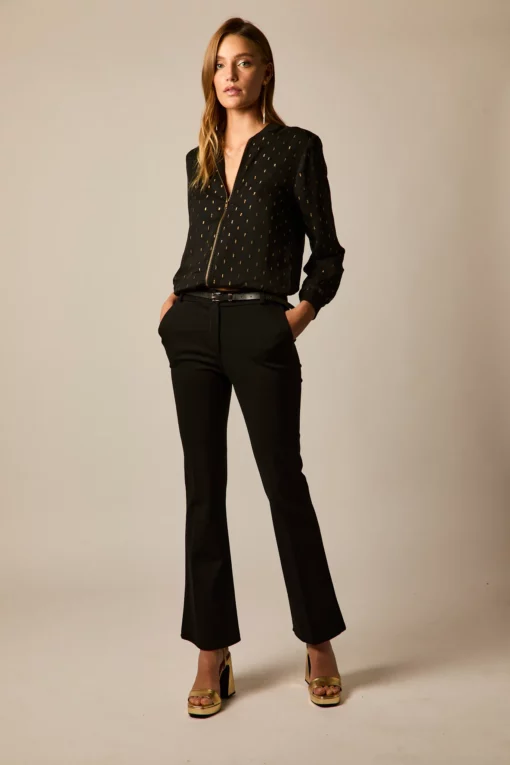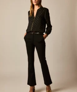 Pantalón sastre en color negro. Tiro medio, pernera recta y acampanado en el bajo. Dos bolsillos, cierre frontal de cremallera y botón y cinturón de tachas.