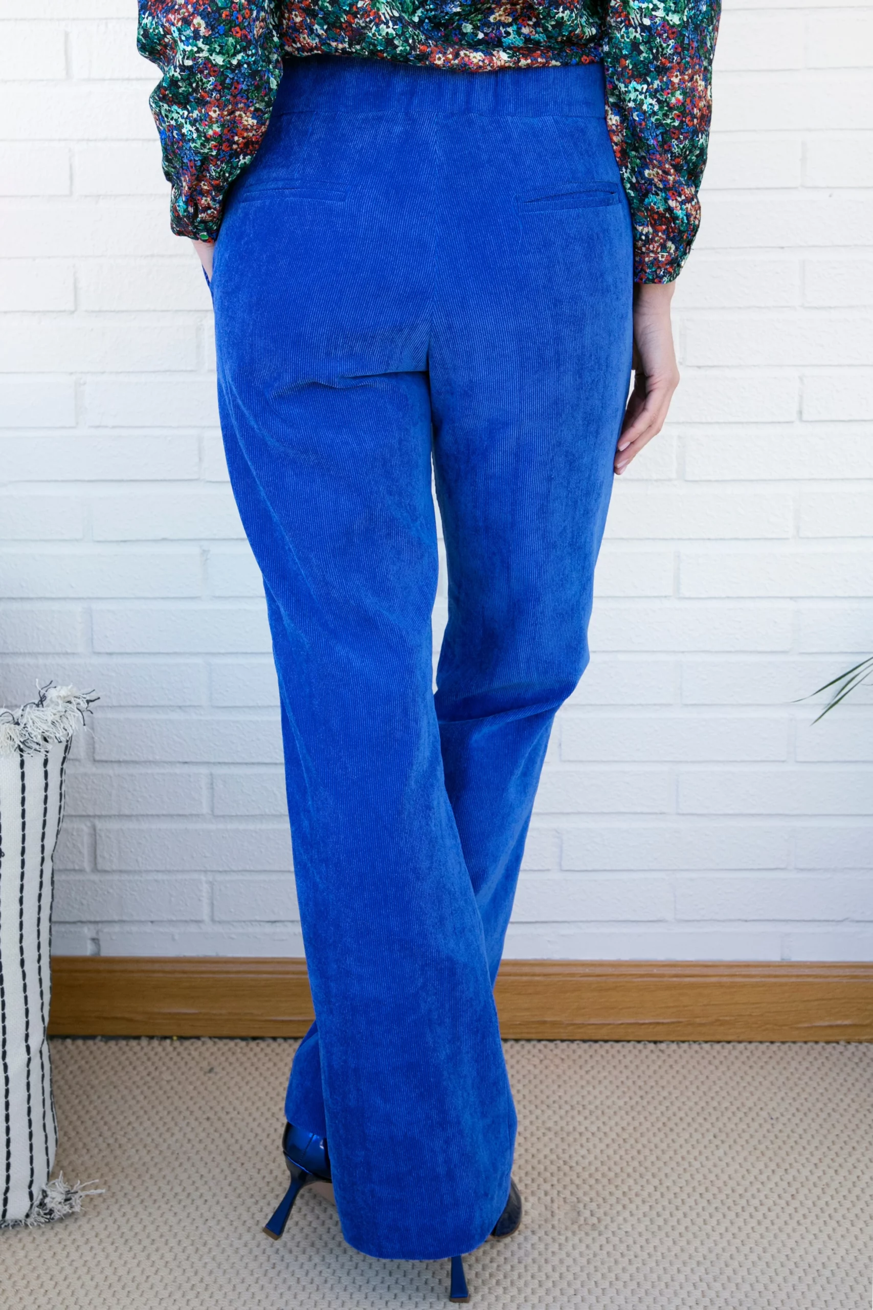 Pantalón en color azulón realizado en un tejido de pana con elastano.