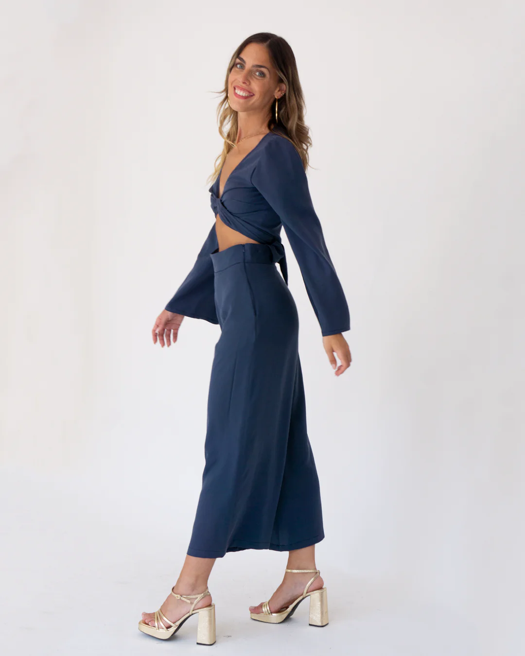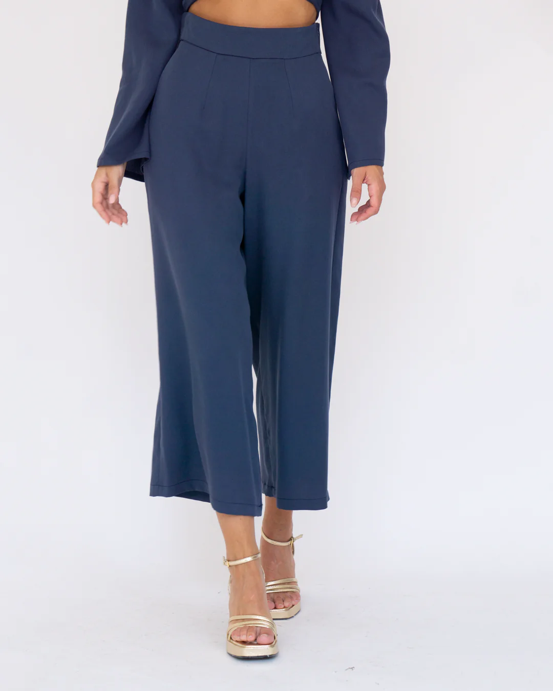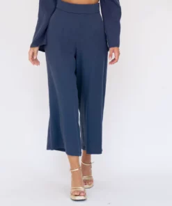 Pantalón midi, de pata ancha. Tiro muy alto. Bolsillos laterales. Cinturilla de 5cm.