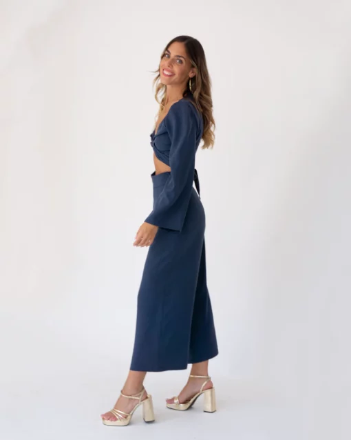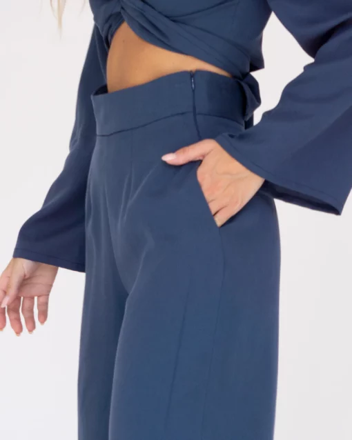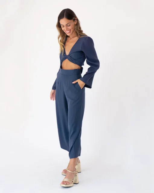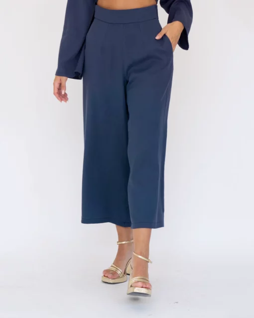Pantalón midi, de pata ancha. Tiro muy alto. Bolsillos laterales. Cinturilla de 5cm.