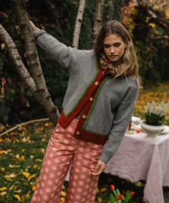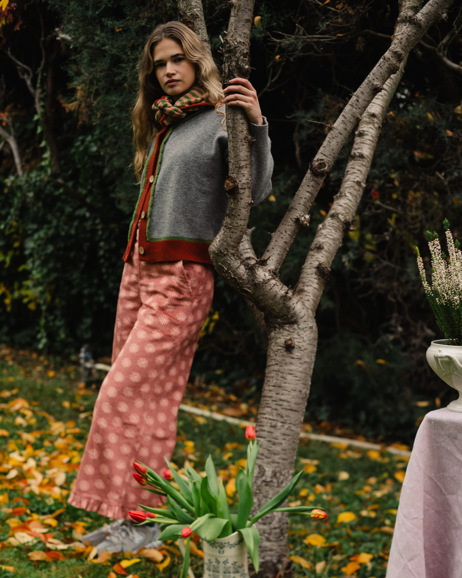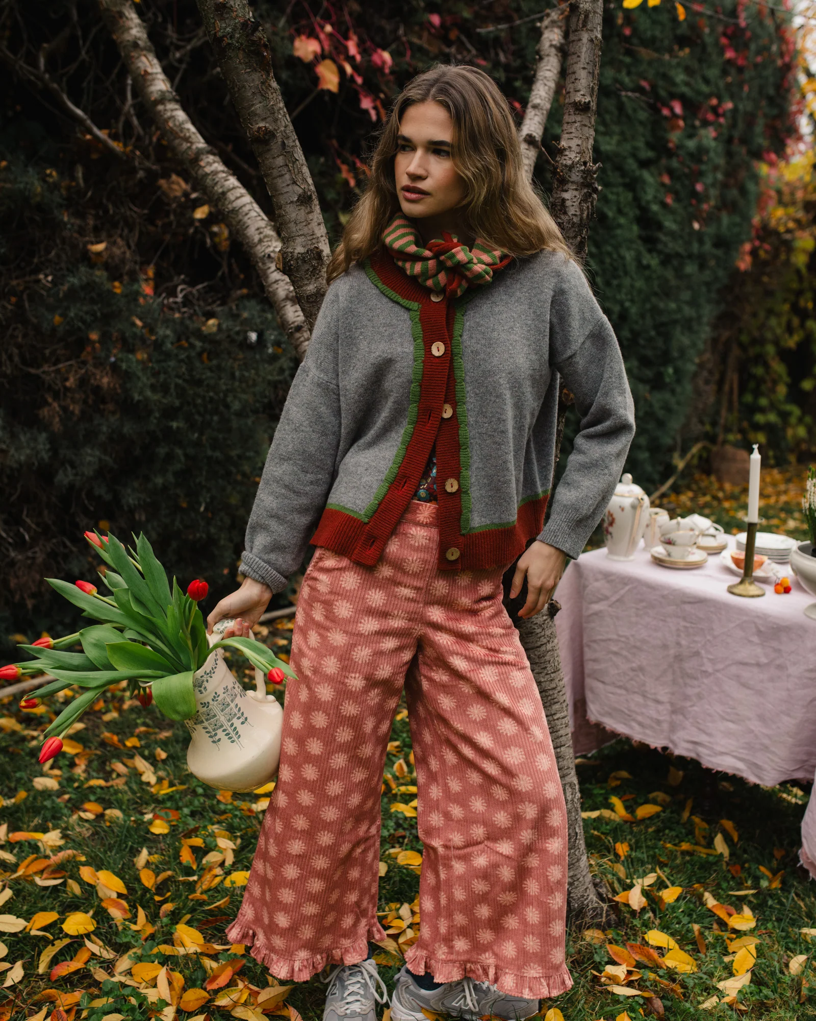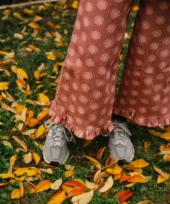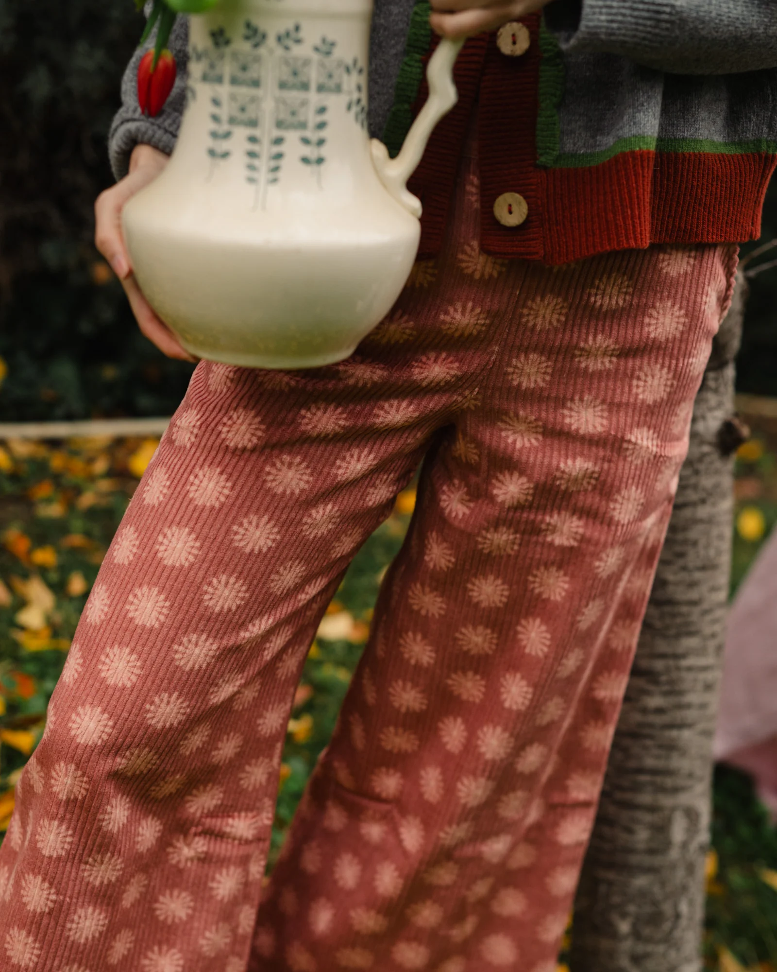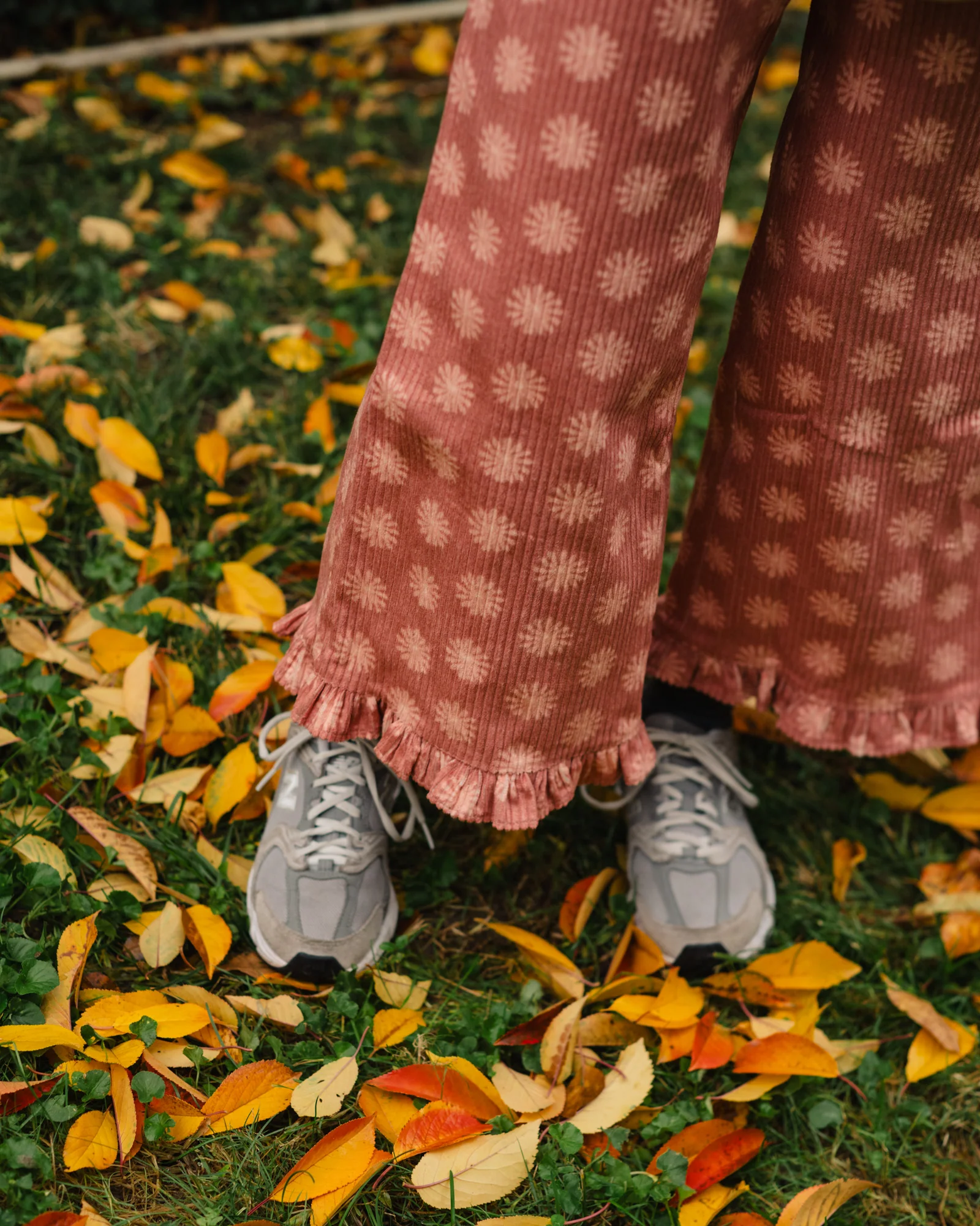 Pantalón de pana fluida con volante en el tobillo, cinturilla y botón.