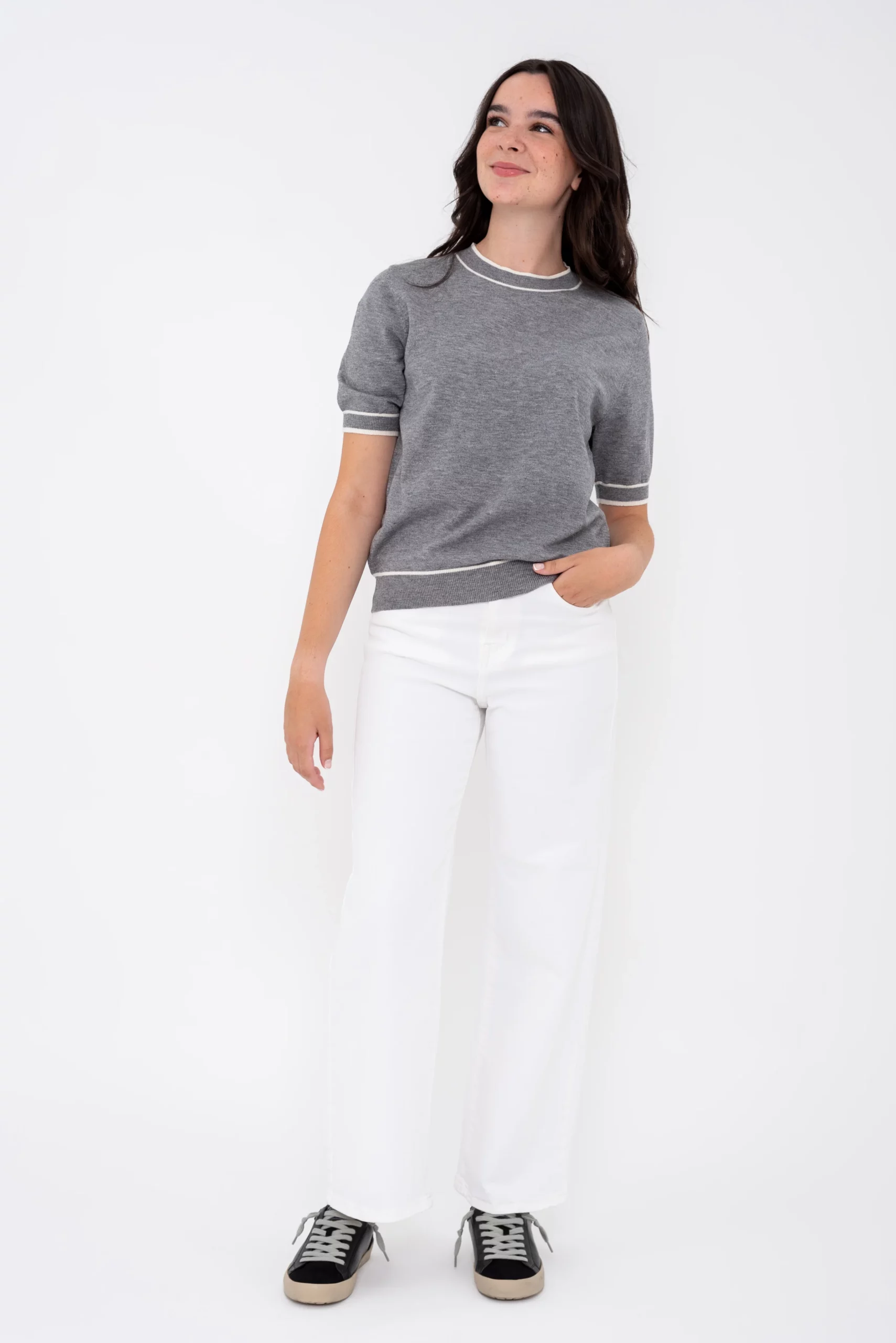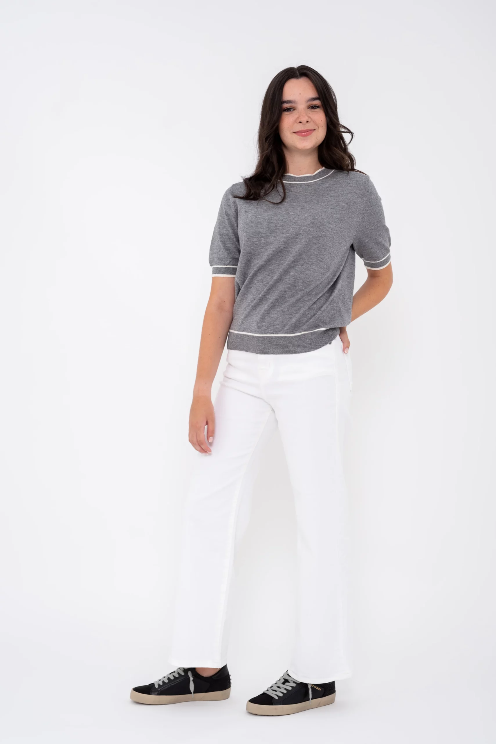 La modelo, Lucia, mide 1.62cm y lleva la XS de este pantalón.