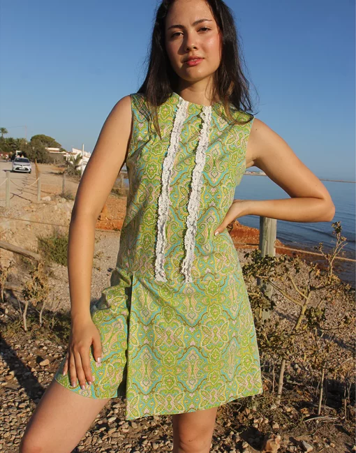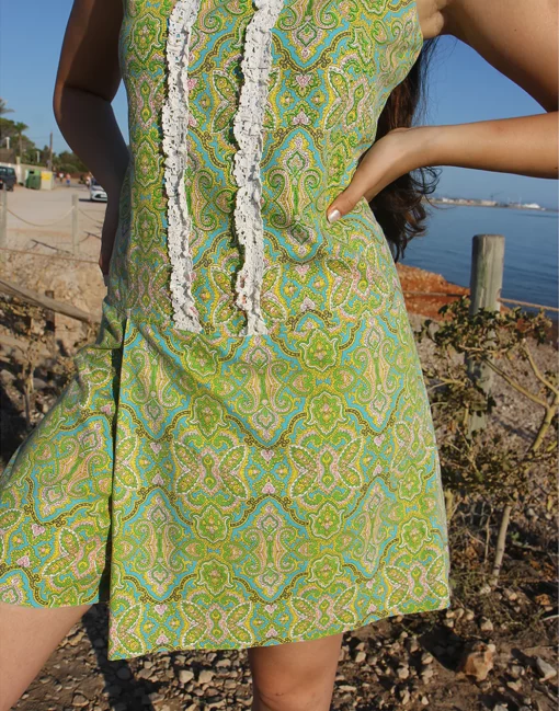 Measurements: 36″/ 91cm bust – 32″ / 81cm waist – 34″ / 86cm hips – 35″ / 89cm playsuit length.