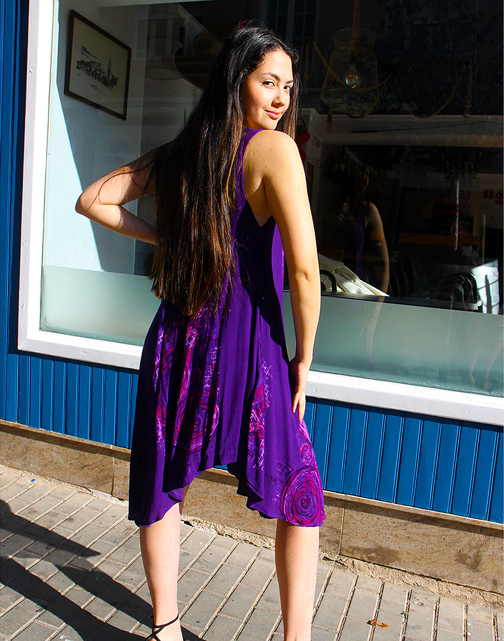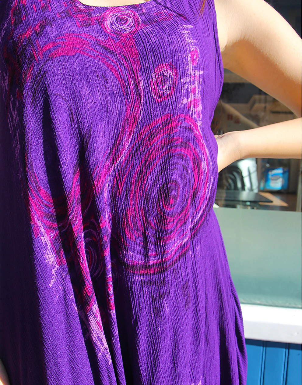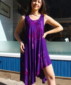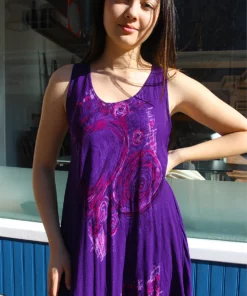 Vintage flowy dress in purple abstract print.