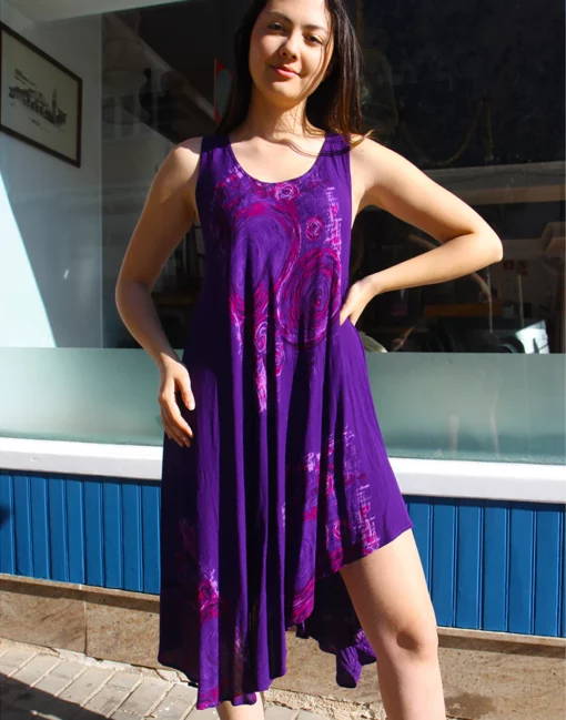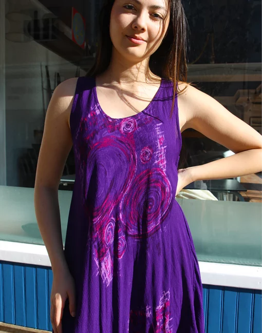 Vintage flowy dress in purple abstract print.