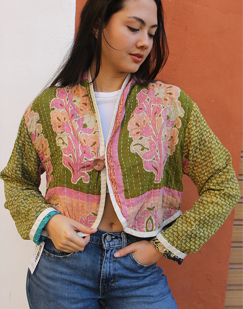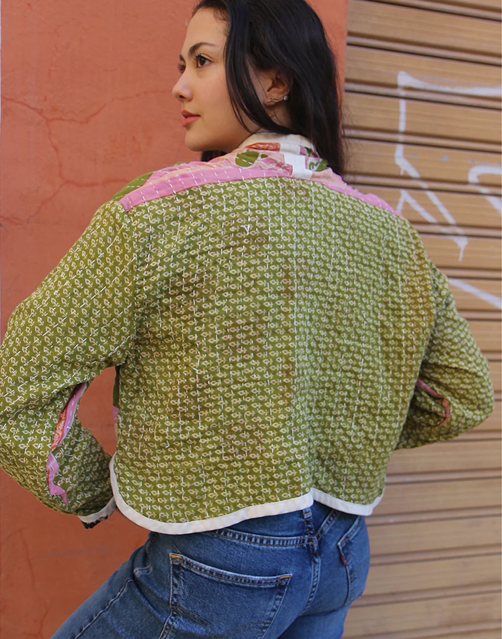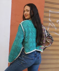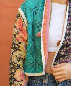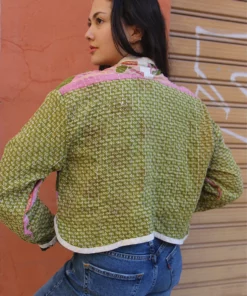 Cotton quilted jacket in green and pink.