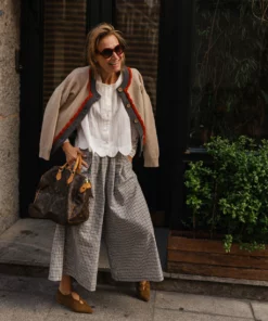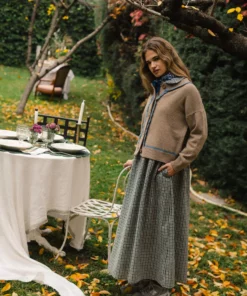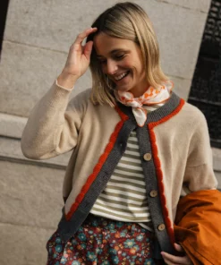 Rebeca cuadrada en color camel con ondas azules. Gustosa y especial, es un fondo de armario súper especial y un regalo perfecto.