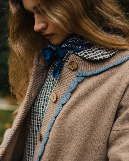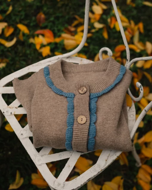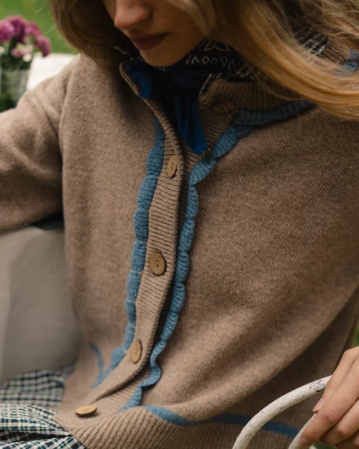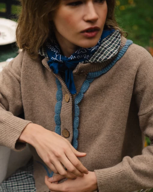 Rebeca cuadrada en color camel con ondas azules. Gustosa y especial, es un fondo de armario súper especial y un regalo perfecto.