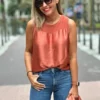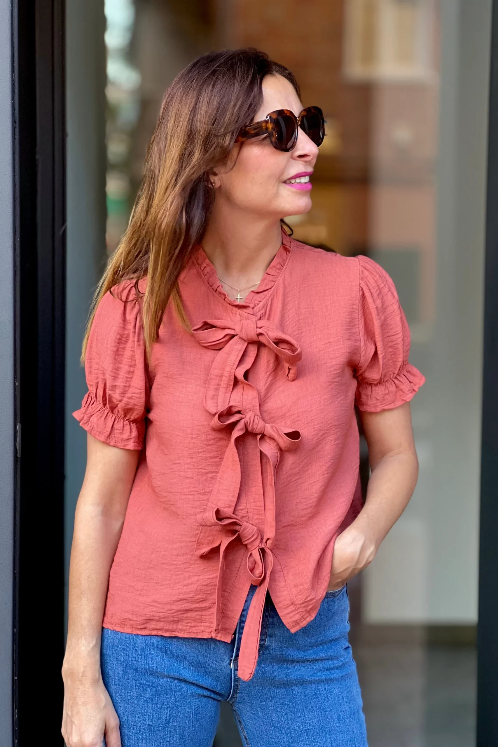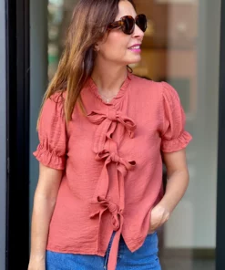 Blusa manga corta, cuello redondo. Cierre con tres lazadas. Tejido flluido y comodo. Ideal para combinar.