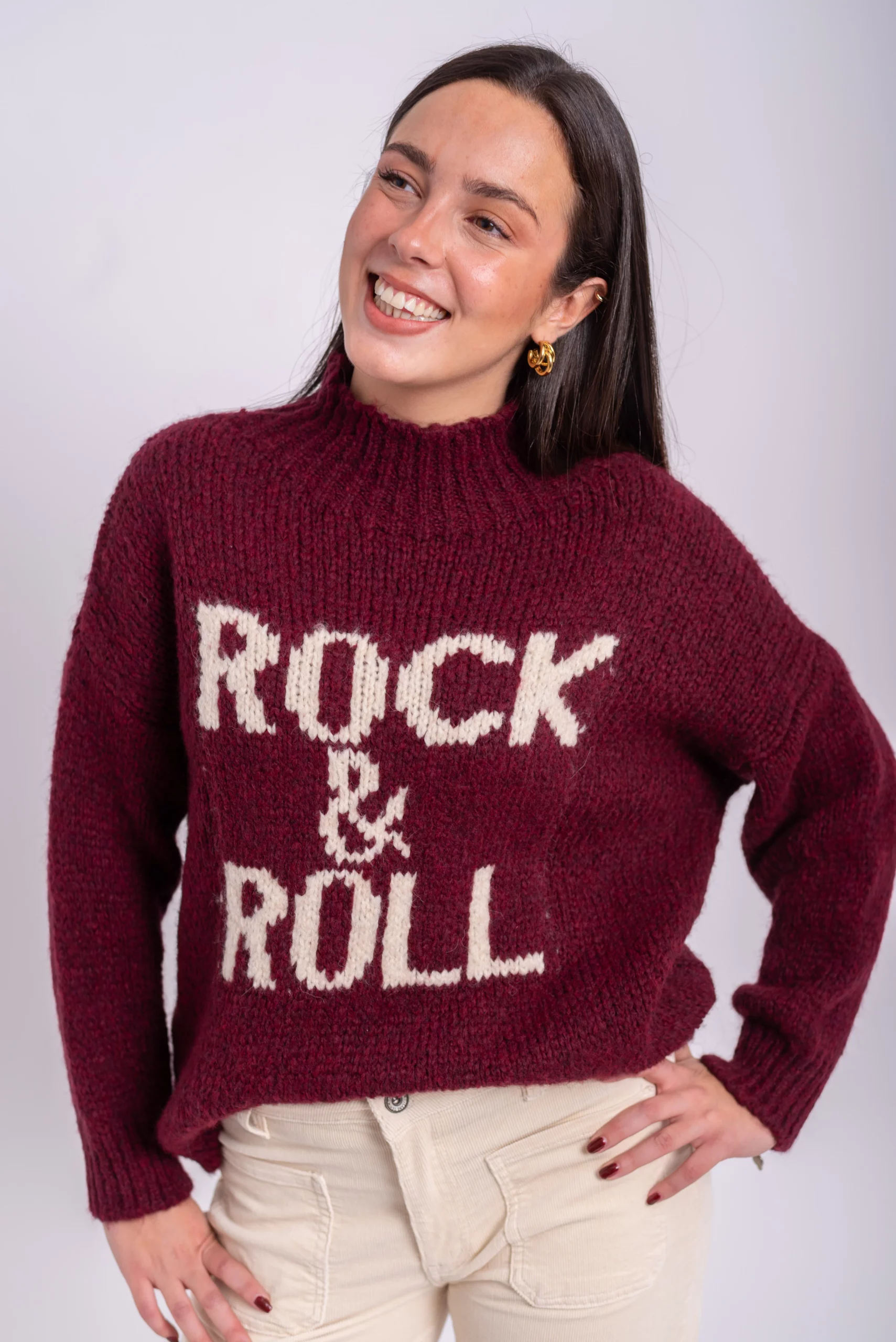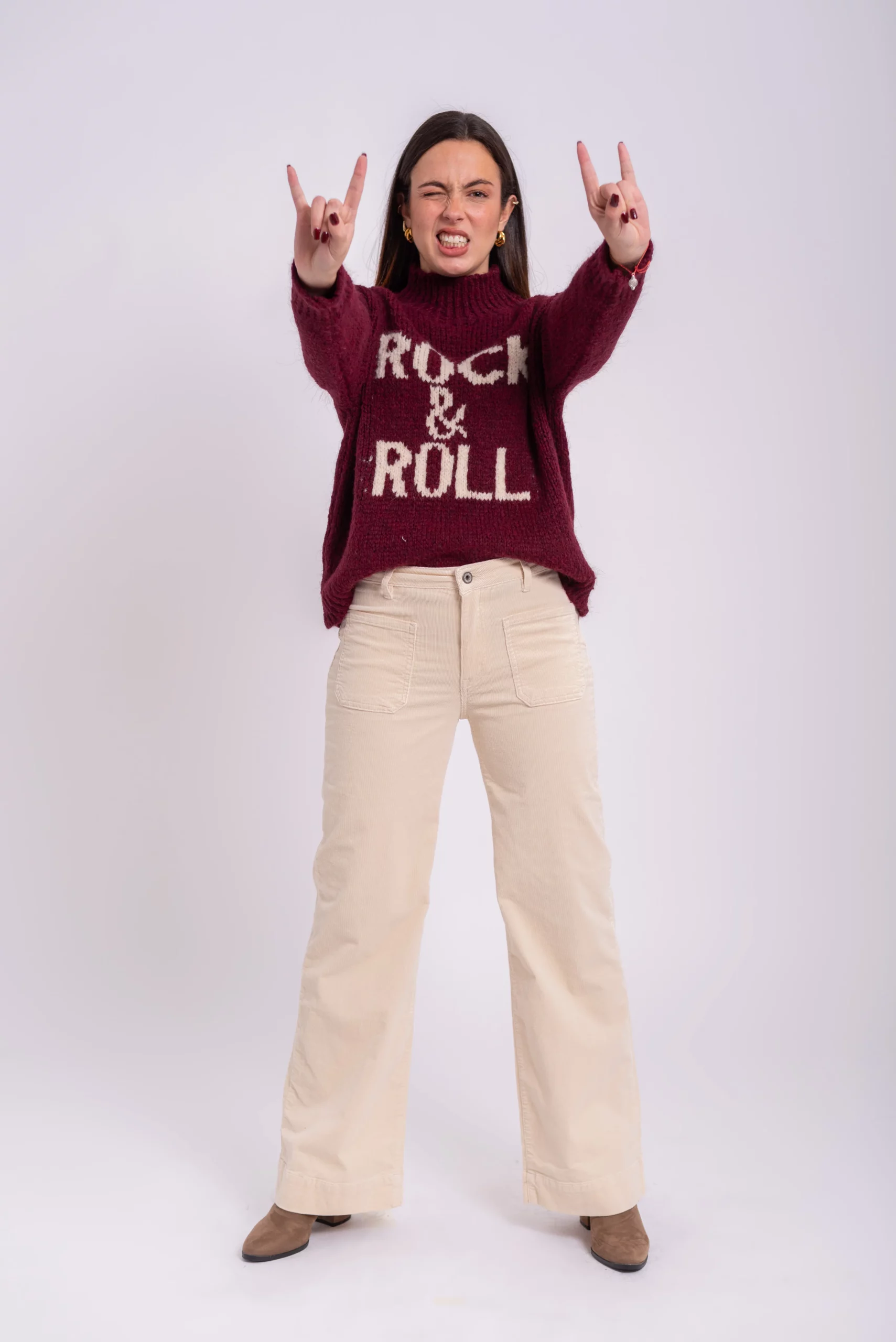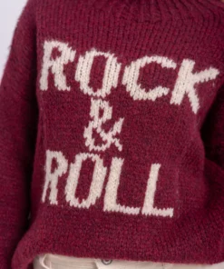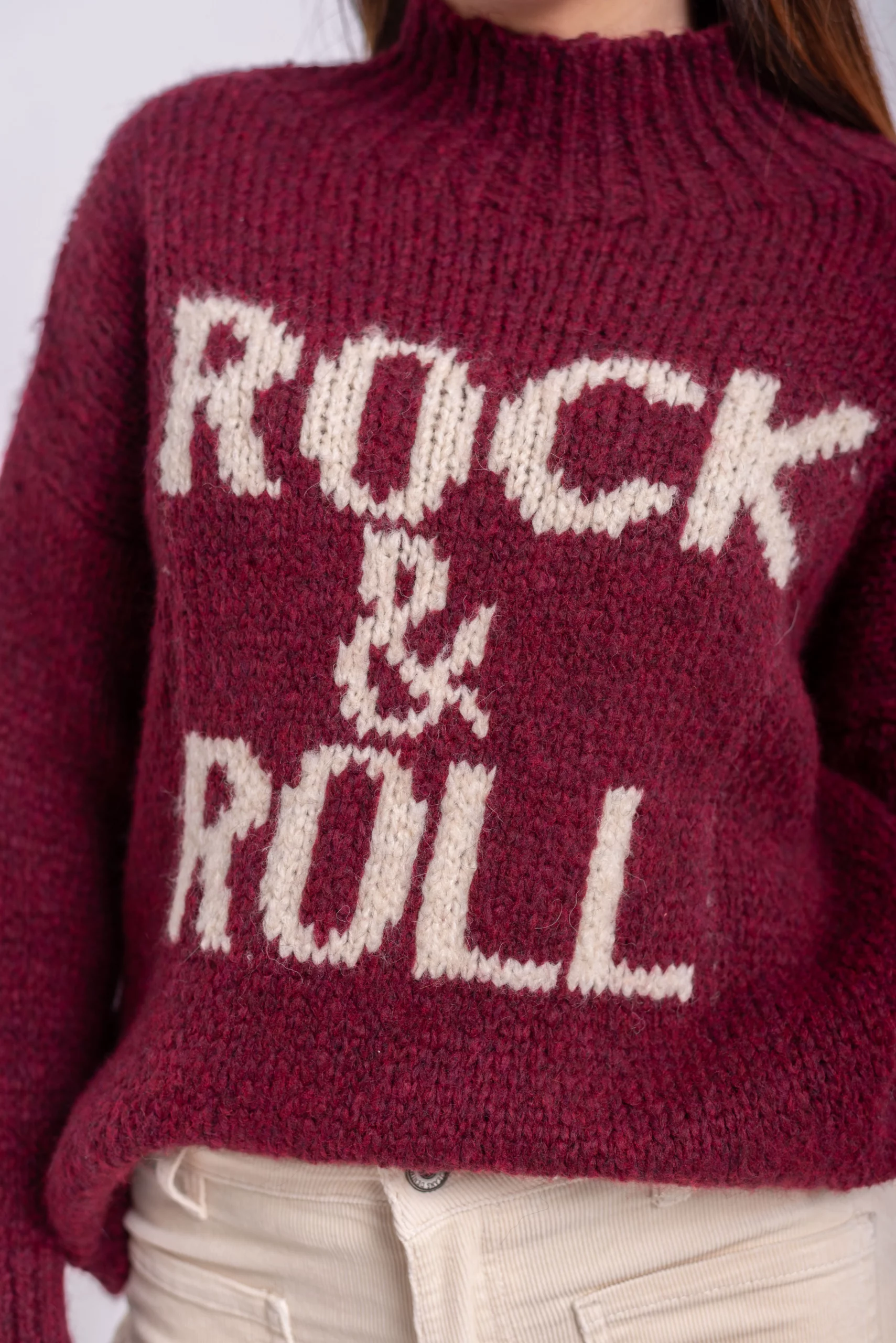 Jersey punto grueso con cuello chimenea. Leyenda Rock and Roll tejido en tono a contraste. Corte amplio y comodo.