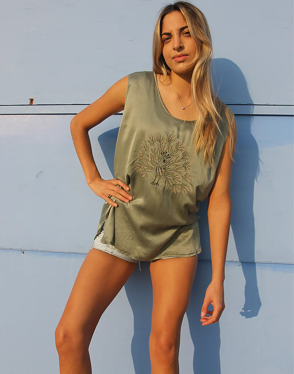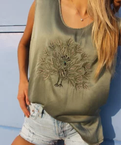 Embroidered peacock to front.