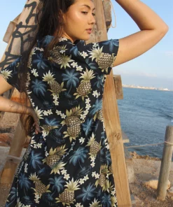 Measurements: 38″/ 97cm bust – 32″ / 81cm waist – 42″ / 107cm hips – 7″ / 18cm sleeve length – 40″ / 102cm dress length.