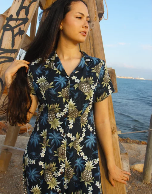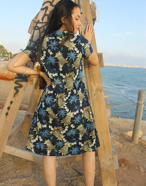 Measurements: 38″/ 97cm bust – 32″ / 81cm waist – 42″ / 107cm hips – 7″ / 18cm sleeve length – 40″ / 102cm dress length.