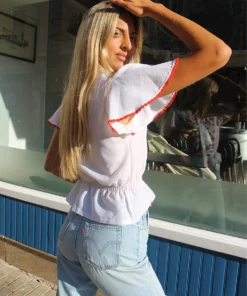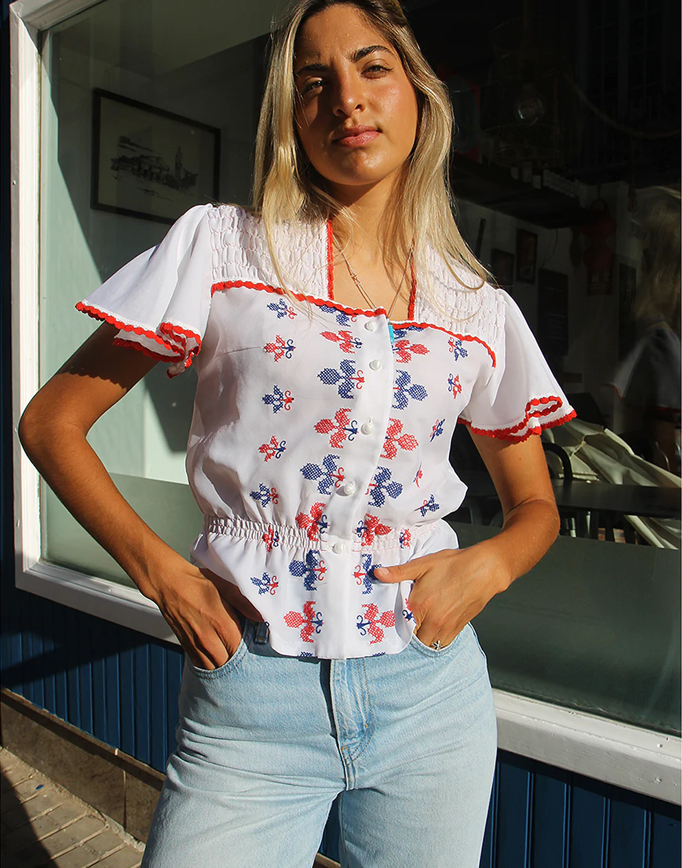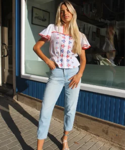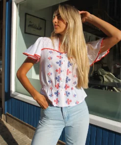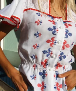 Vintage white blouse with blue and red embroidery.