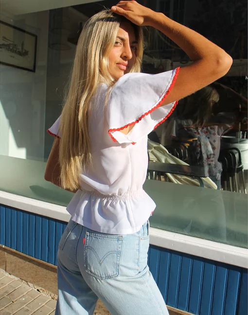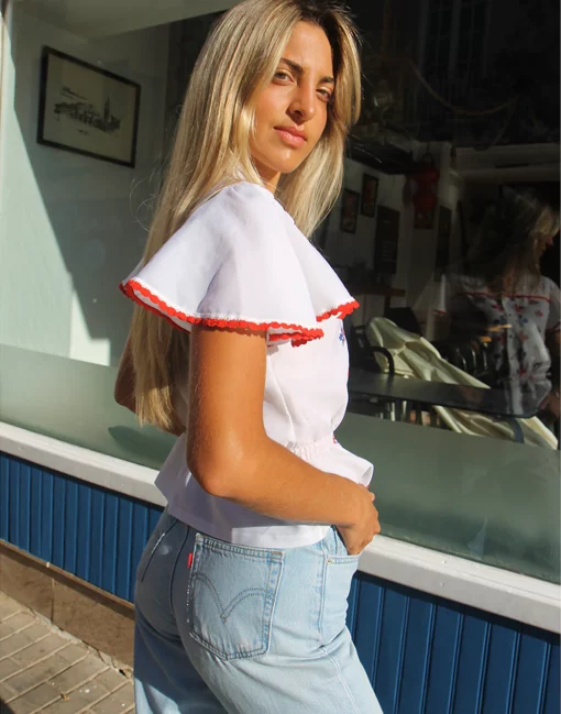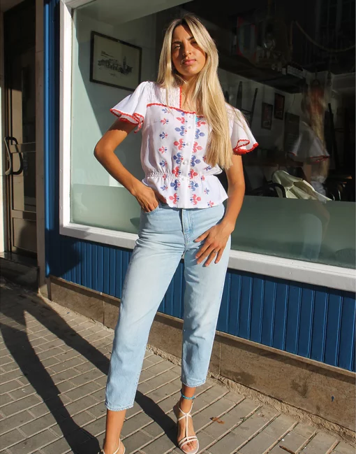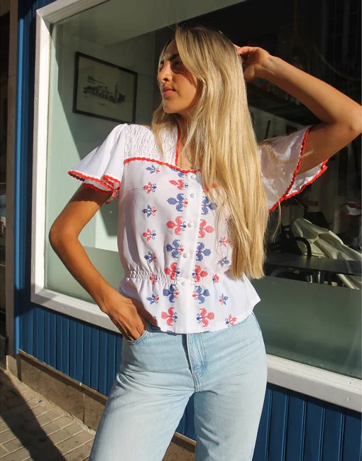 Vintage white blouse with blue and red embroidery.