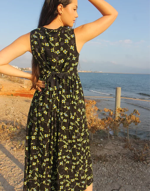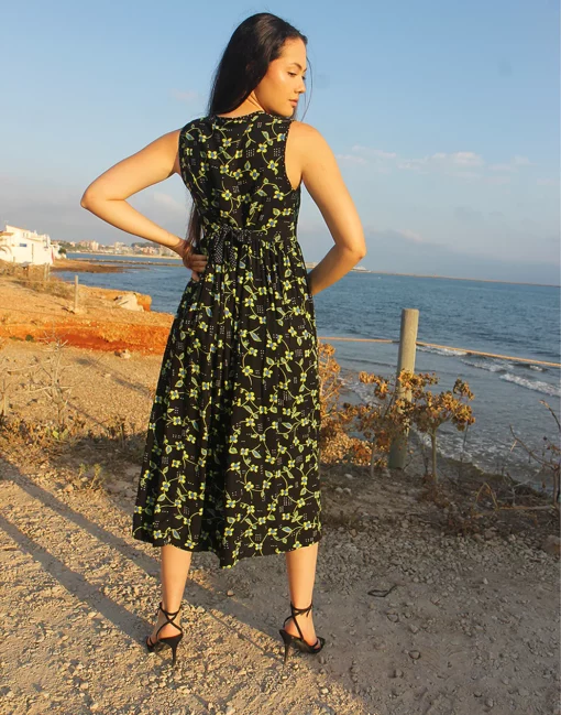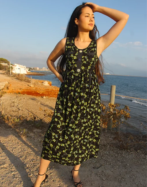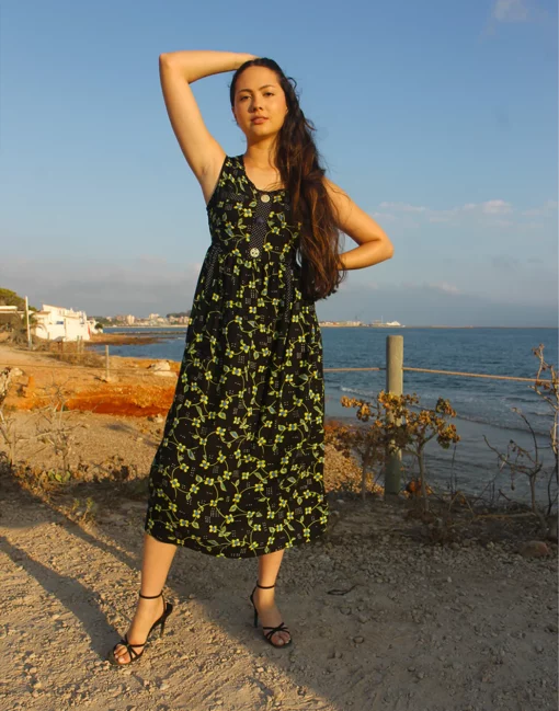 Measurements: 38″/ 81cm bust – 34″ / 66cm waist – 58″ / 91cm hips – 49″ / 124cm dress length.