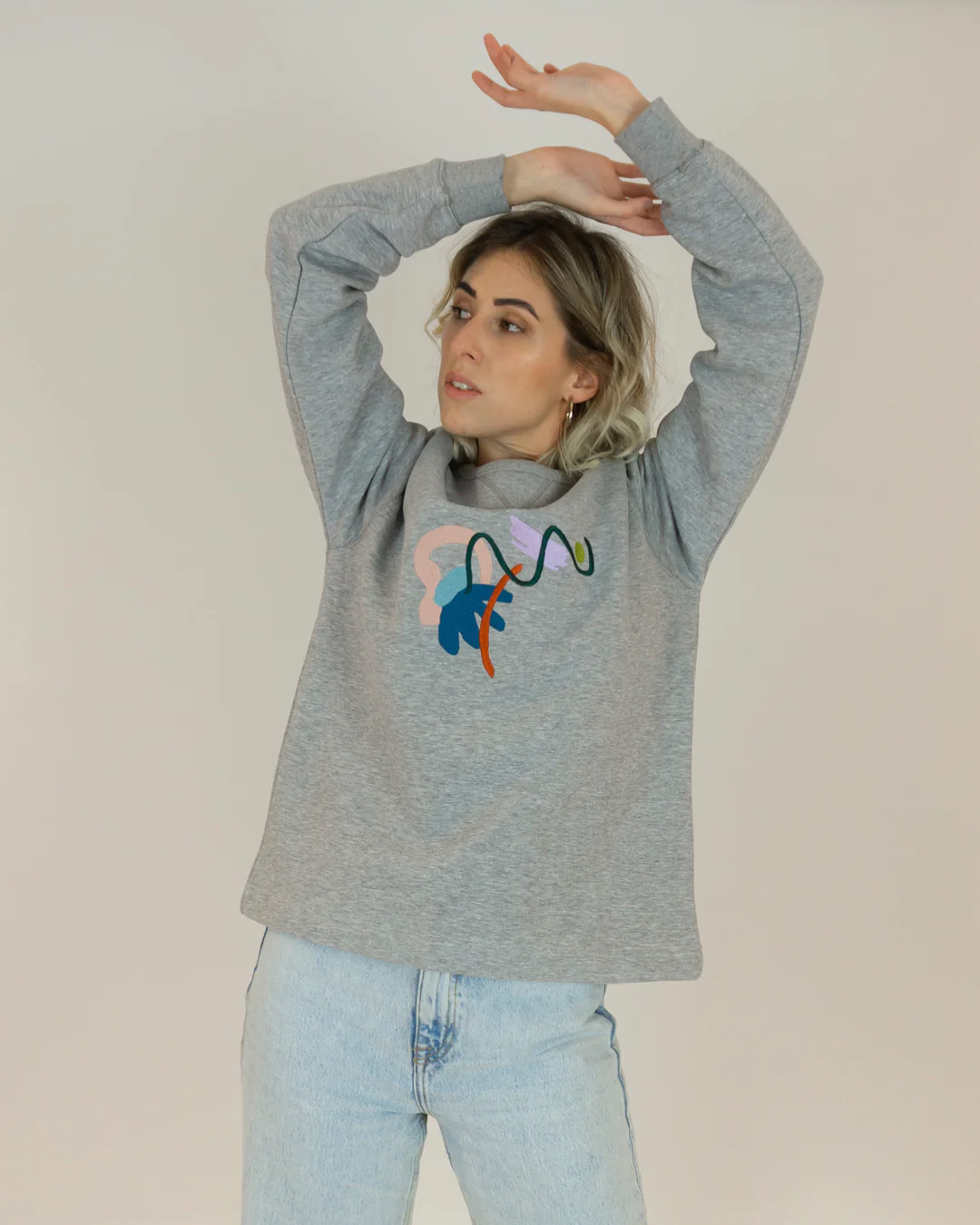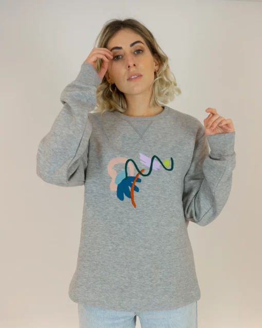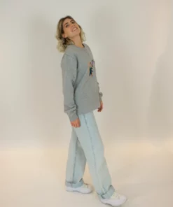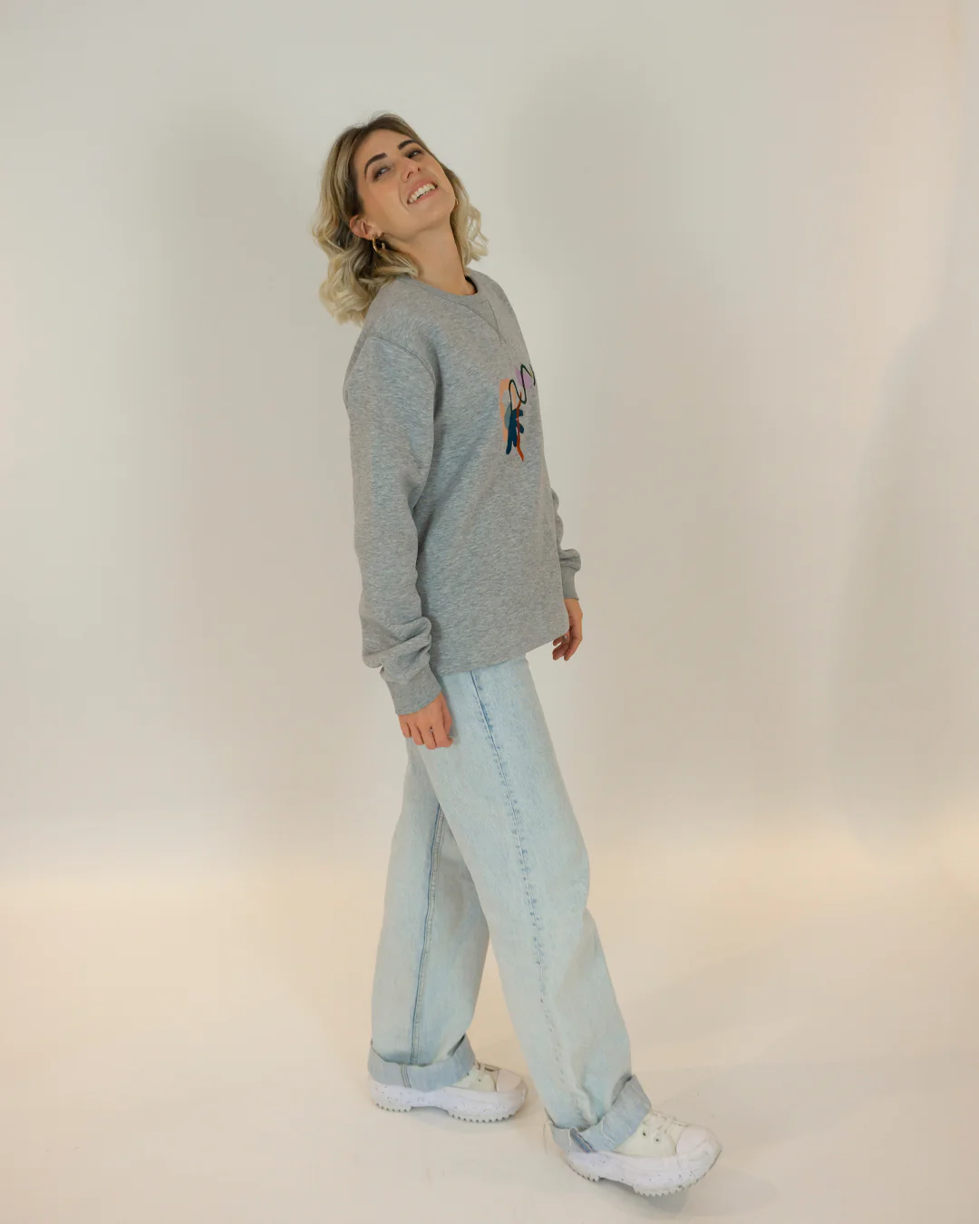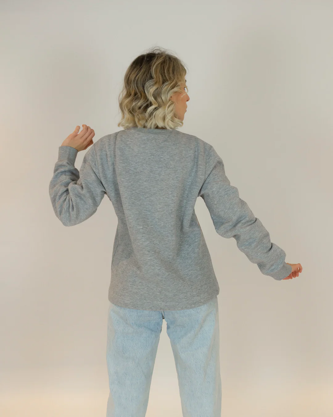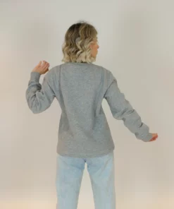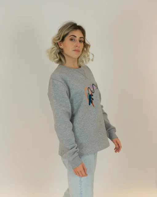 Sudadera gris unisex de manga larga y cuello a la caja con bordado original Roca Mood . Puños, cuello y cinturilla de punto canalé elástico.
