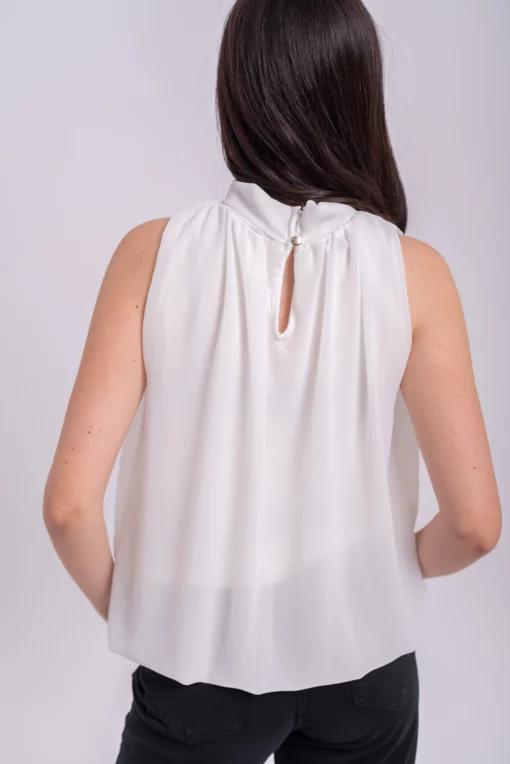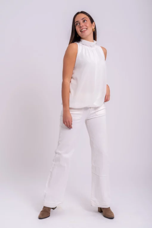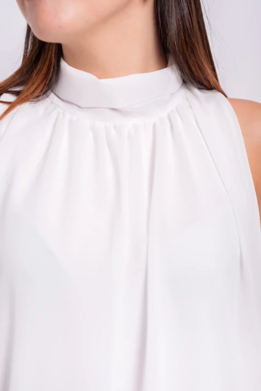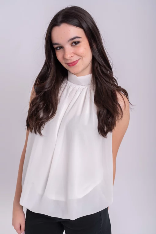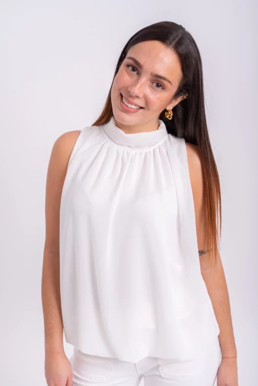 Blusa sin mangas. Cuello halter. Gasa ligera con forro. Corte abullonado. Largo a cadera. Elastico. Super adaptable y favorecedora.