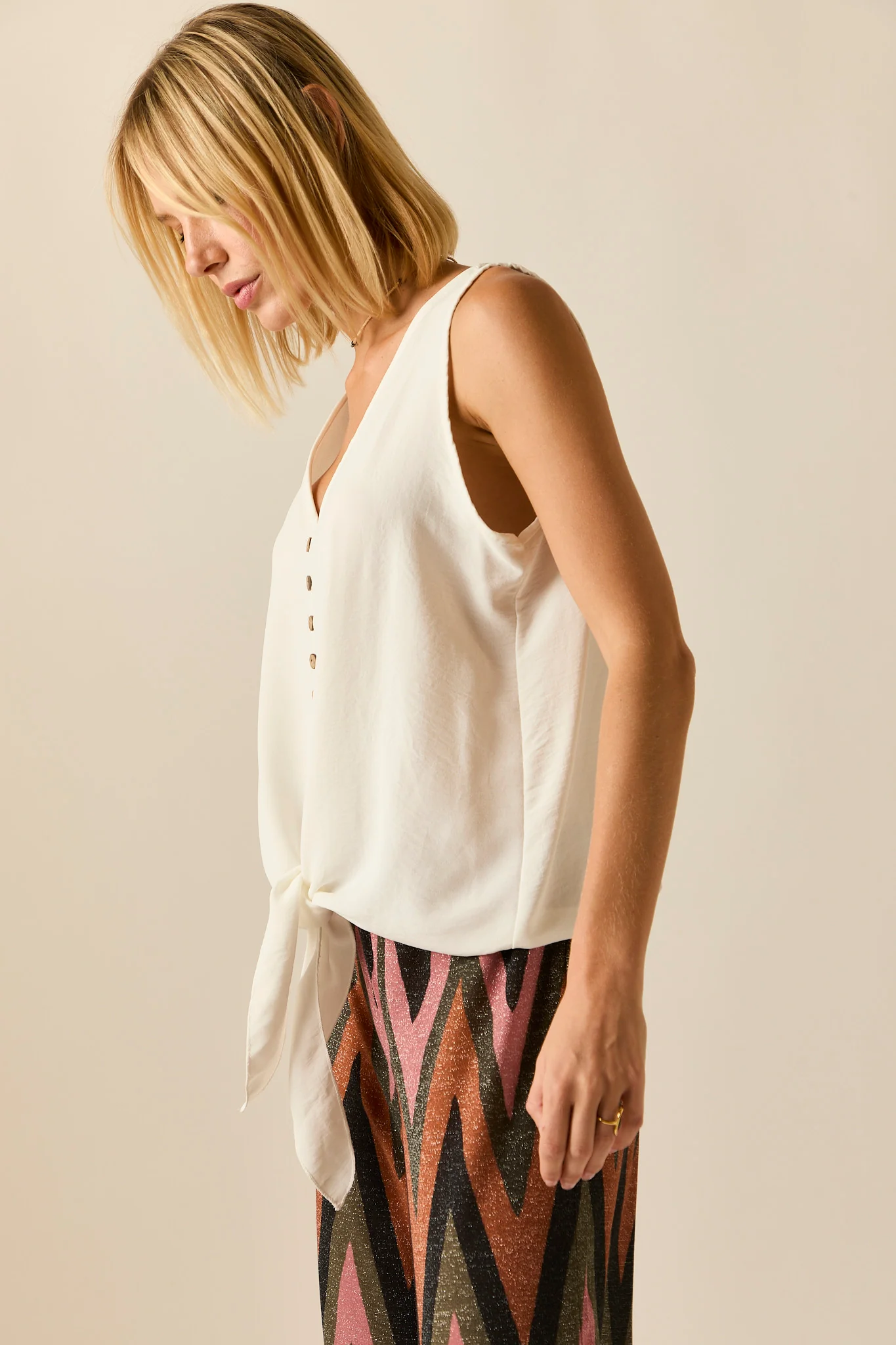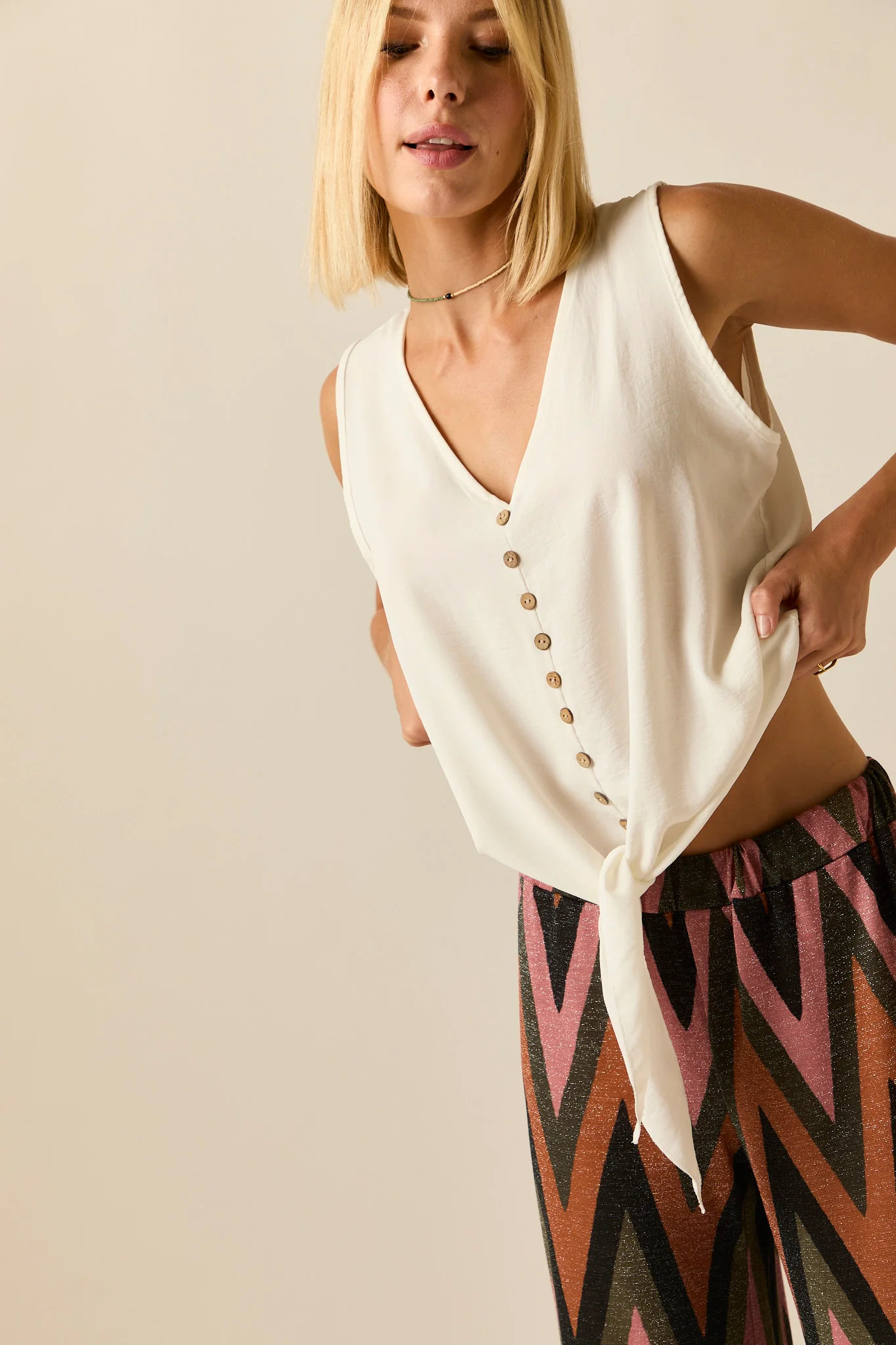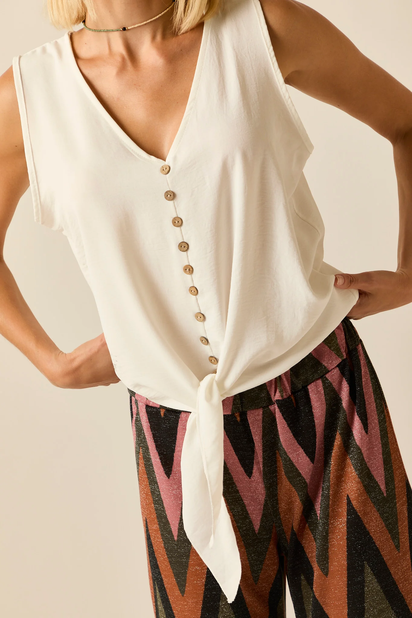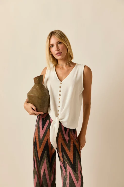 Top fluido en color blanco. Cuello pico, sin mangas, detalle de botones centrales y lazo en la parte de abajo.