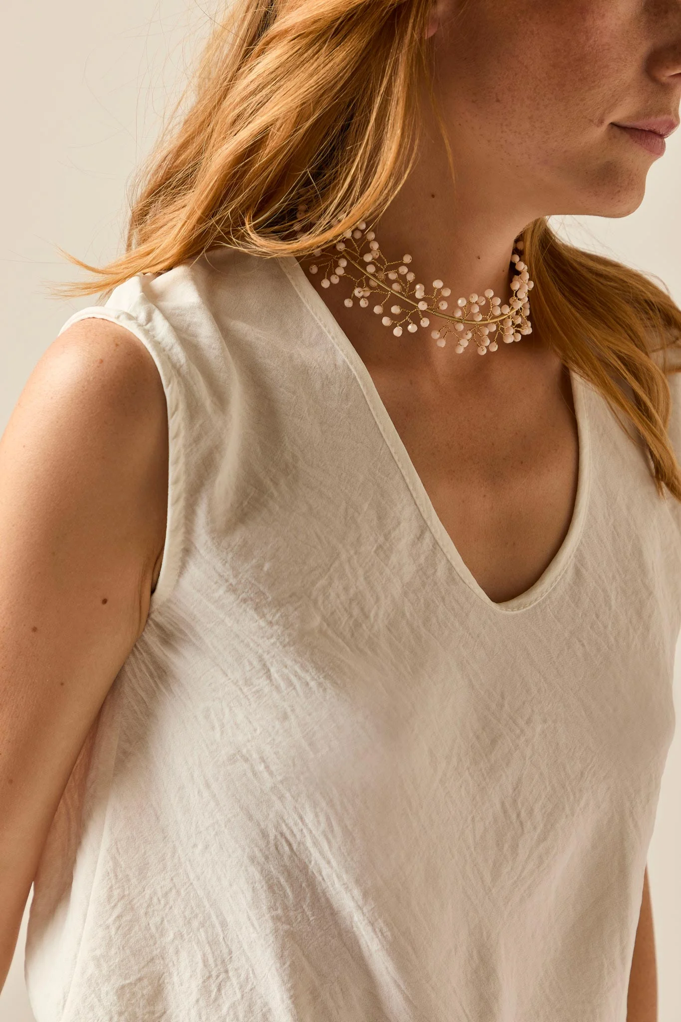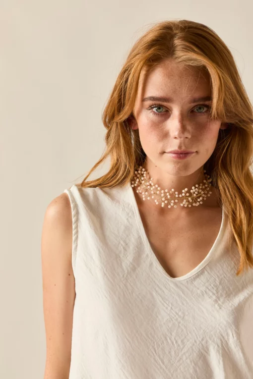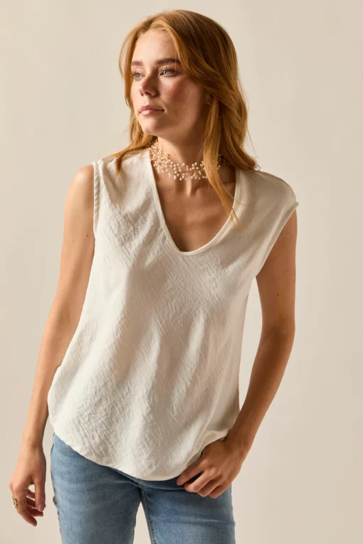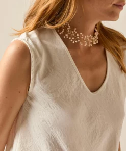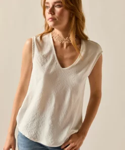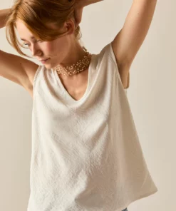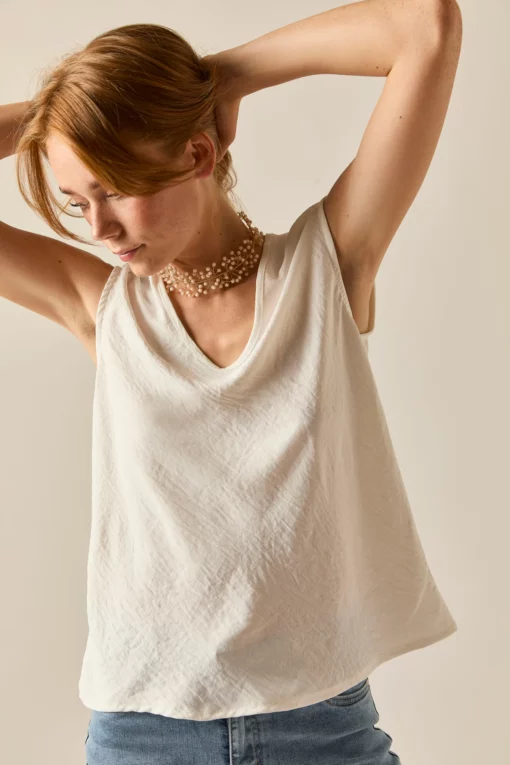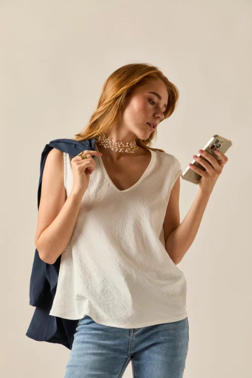 Top básico de diseño fluido en color azul marino. Cuello pico y sin mangas.
