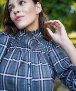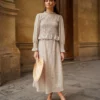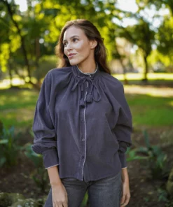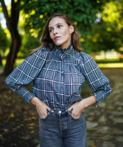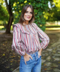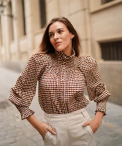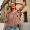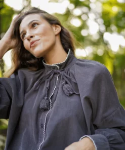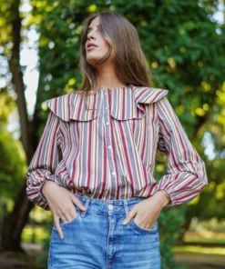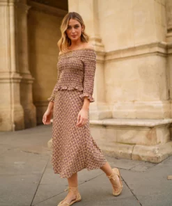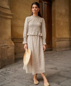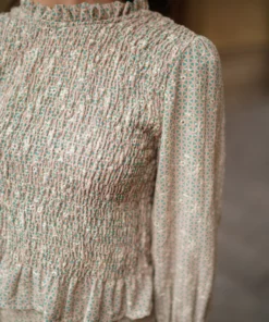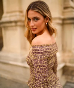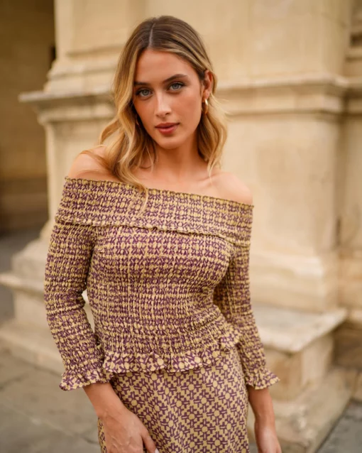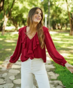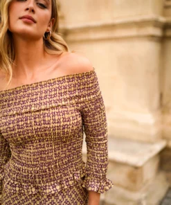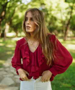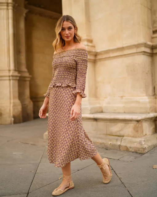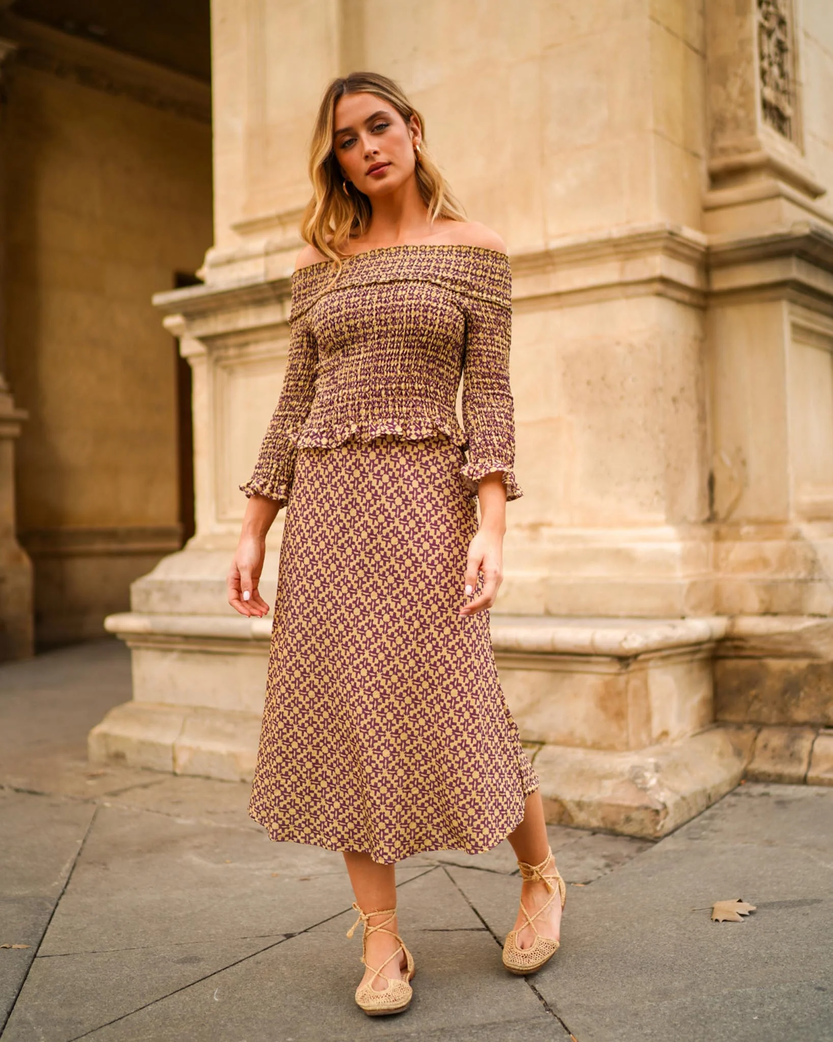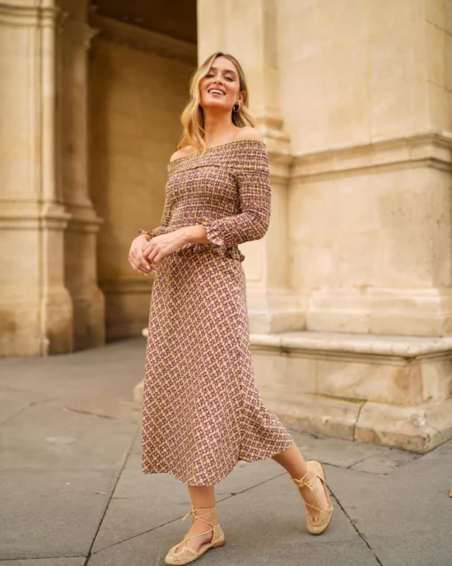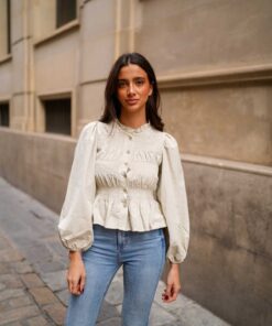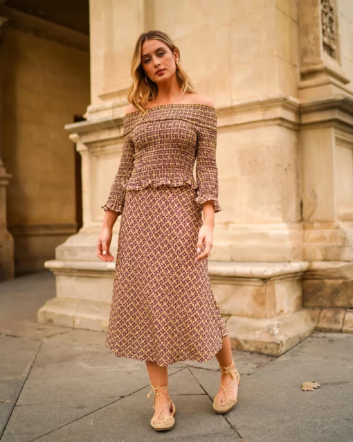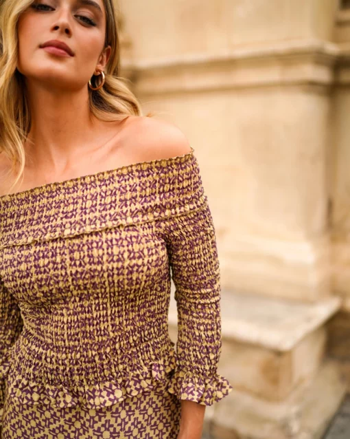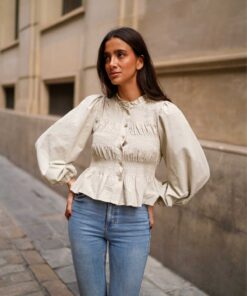 - Hombros al descubierto y ribete de volante en escote, bajo y puños.
