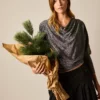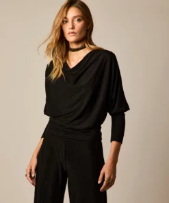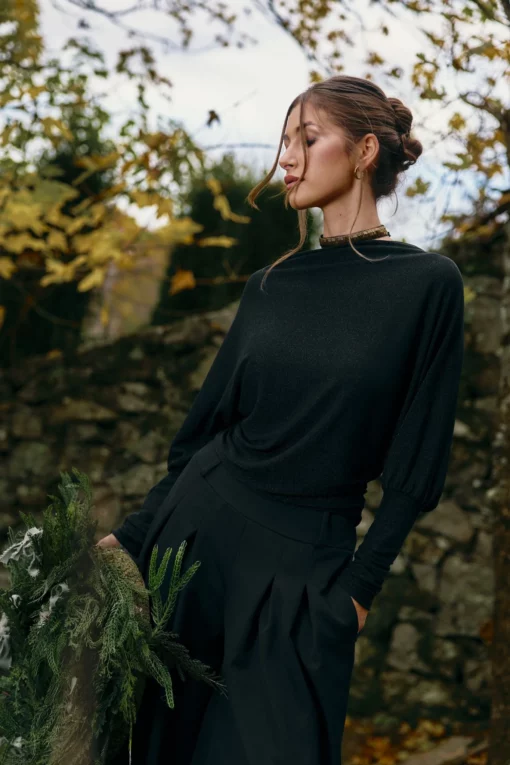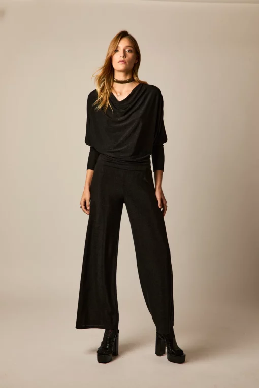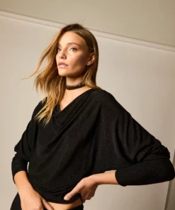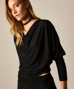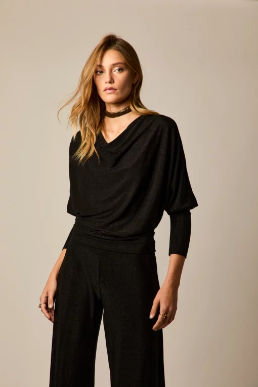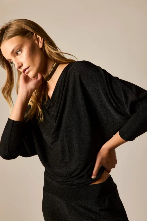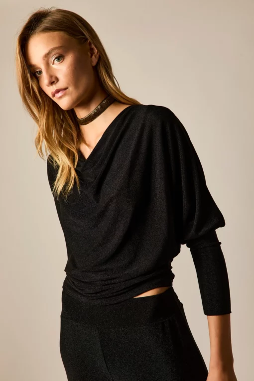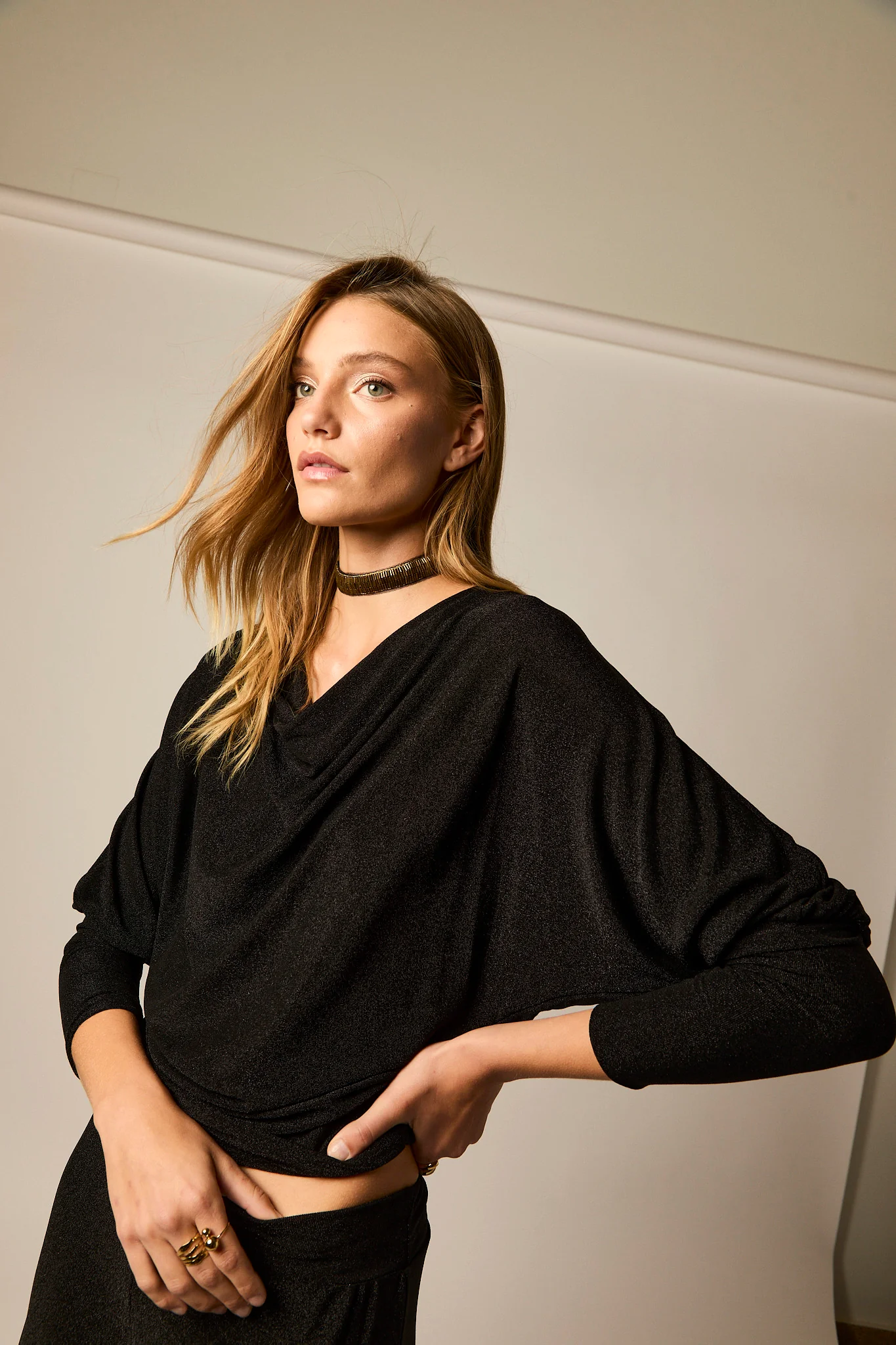 Top drapeado de lurex en color negro. Cuello caído, manga globo, detalles drapeados en la cintura y diseño cropped.