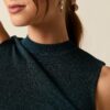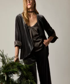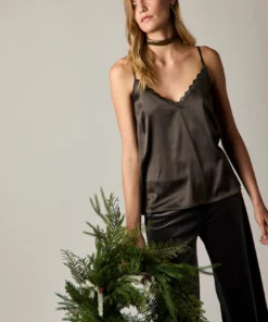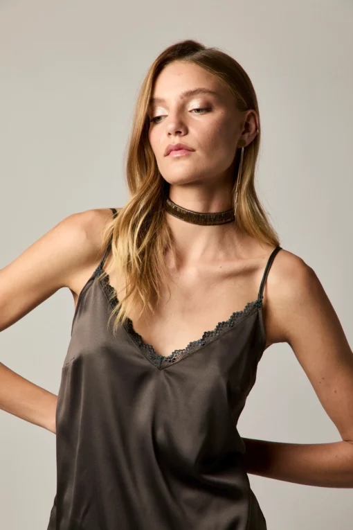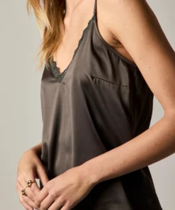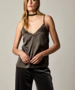 Top lencero de satén en color gris. Cuello pico con detalle de encaje, tirantes ajustables y diseño recto.