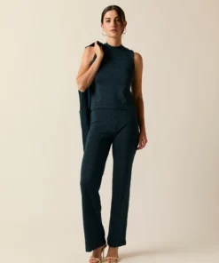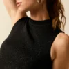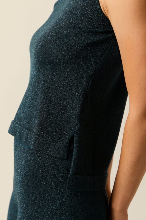 Top lurex en color azul petróleo. Cuello alto, sin mangas y diseño recto con ligeras aberturas laterales.