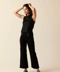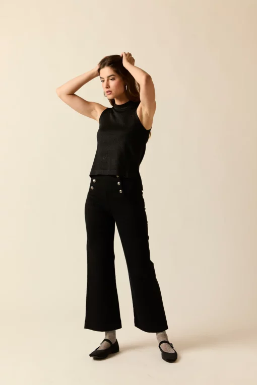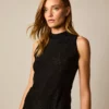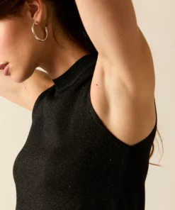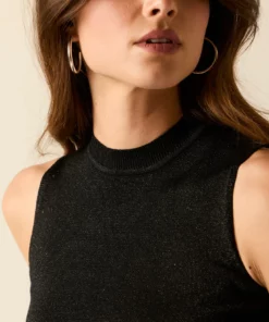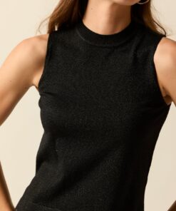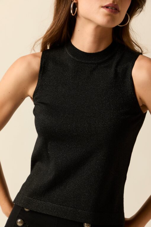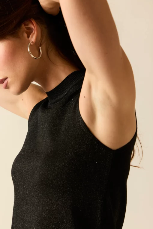 Top lurex en color negro. Cuello alto, sin mangas y diseño recto con ligeras aberturas laterales.