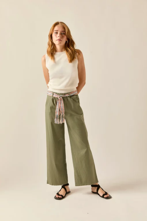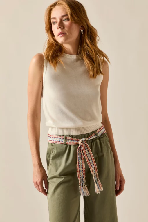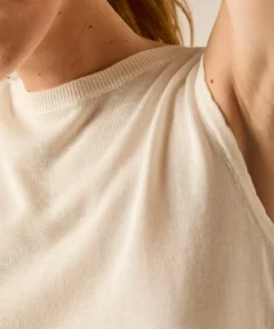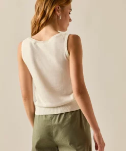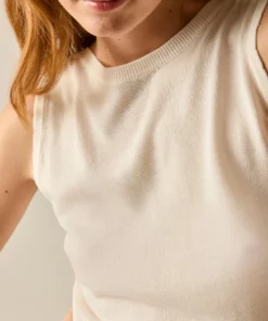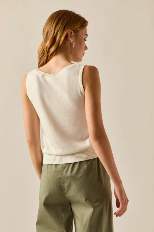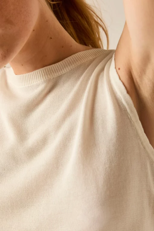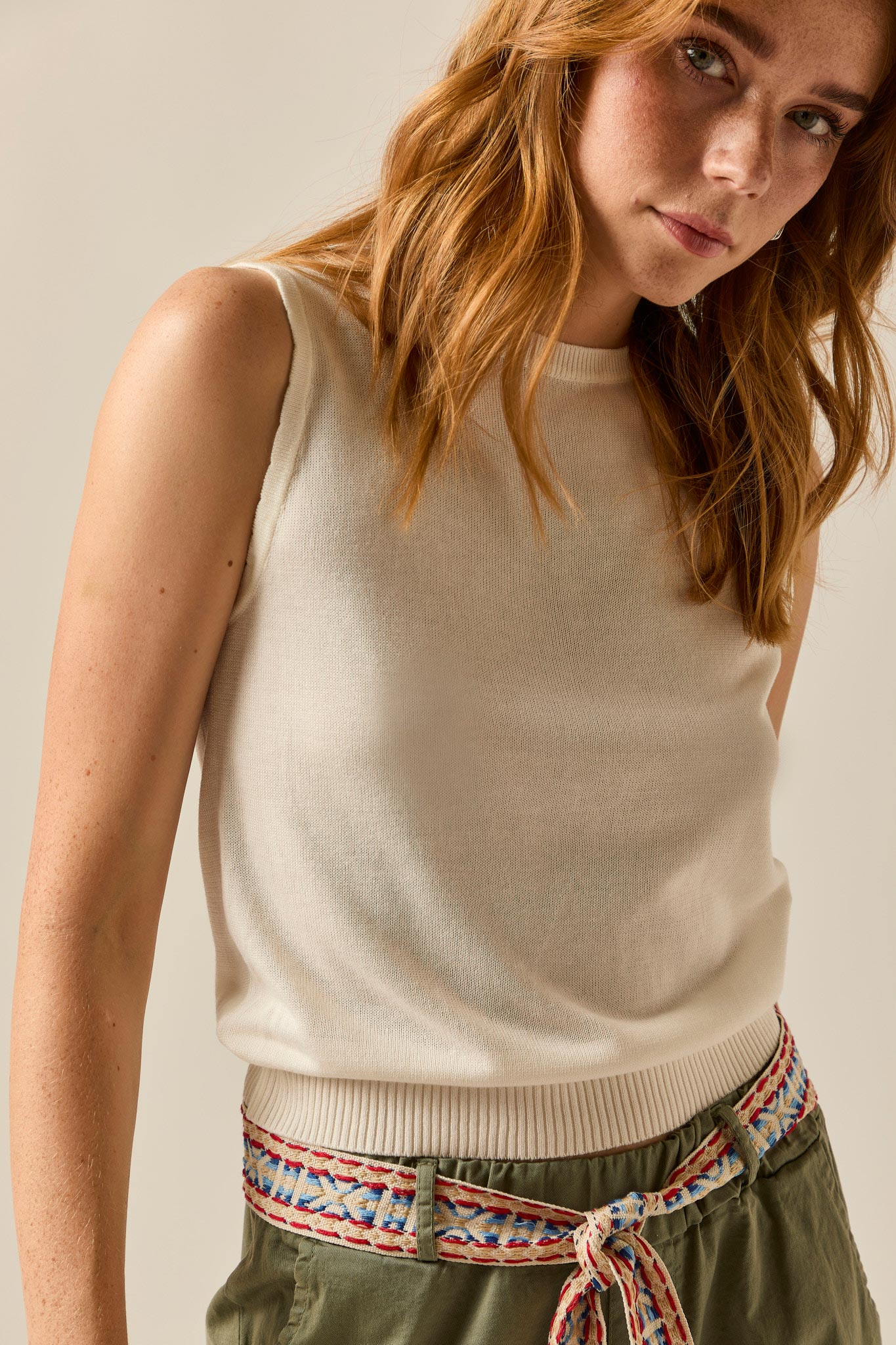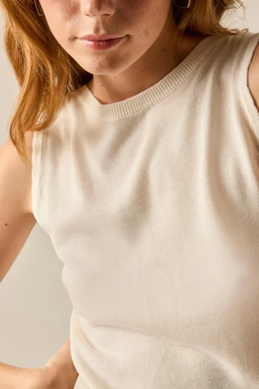 Top básico de punto en color crema. Cuello caja, sin mangas y diseño recto.