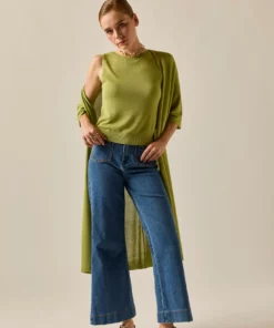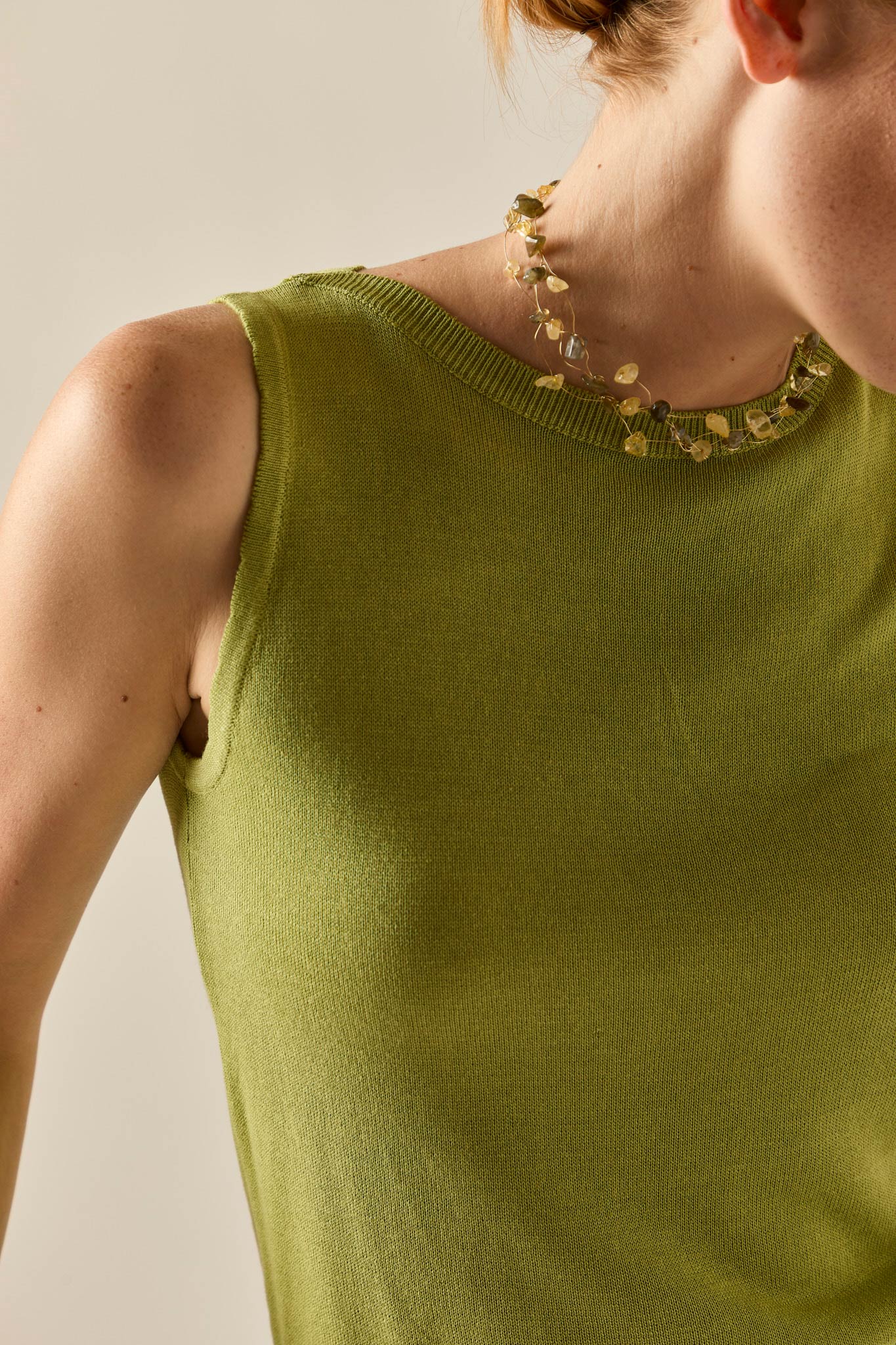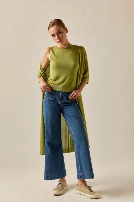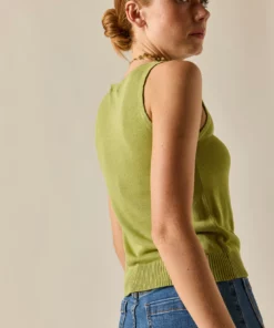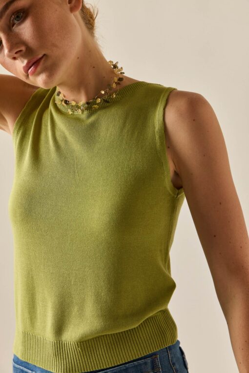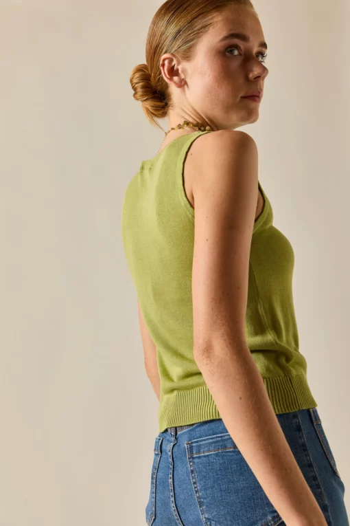 Top básico de punto en color lima. Cuello caja, sin mangas y diseño recto. Puedes combinarla con su cárdigan a juego y ¡estarás ideal!