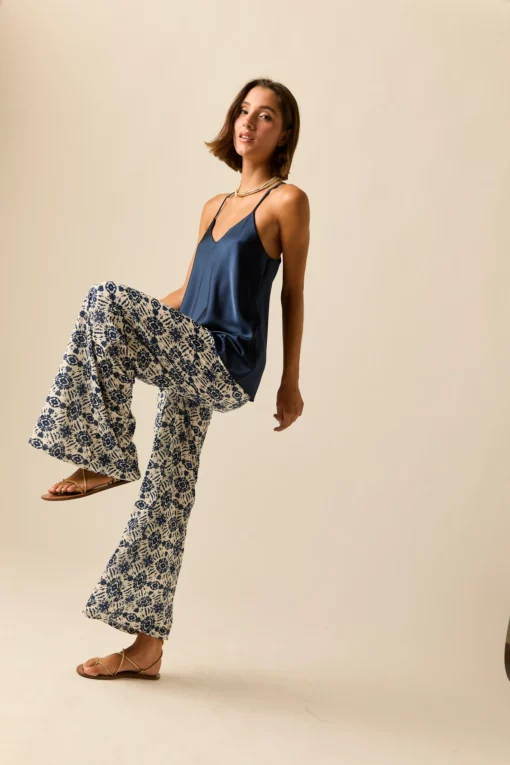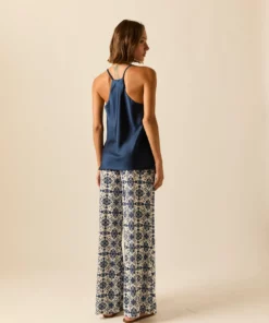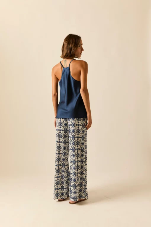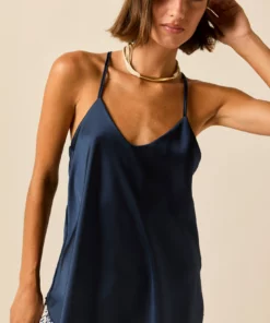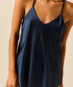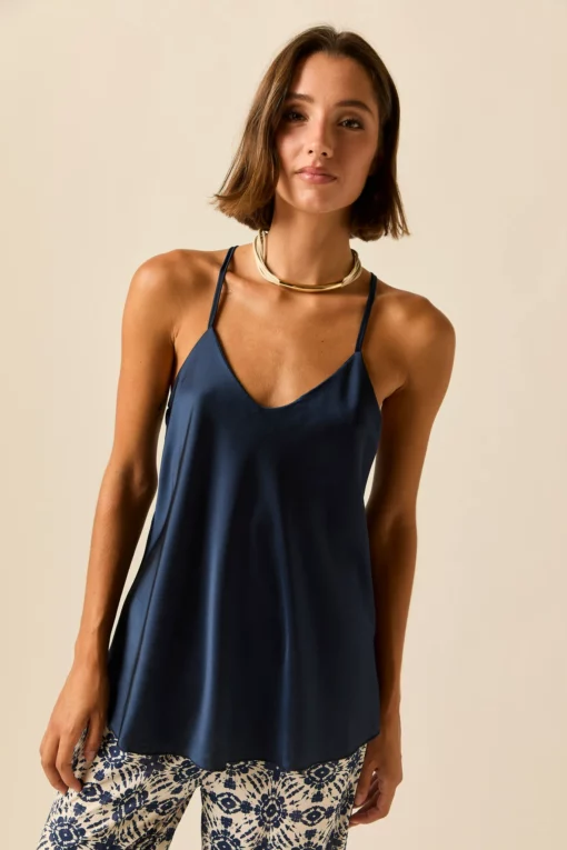 Top de raso en color azul marino. Cuello pico, tirante fino y diseño recto y fluido.