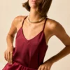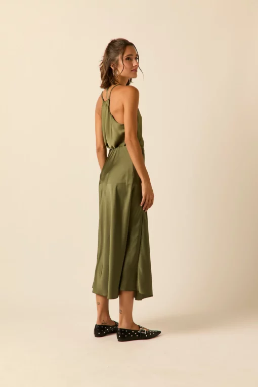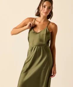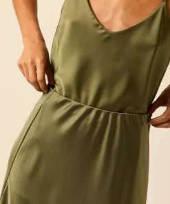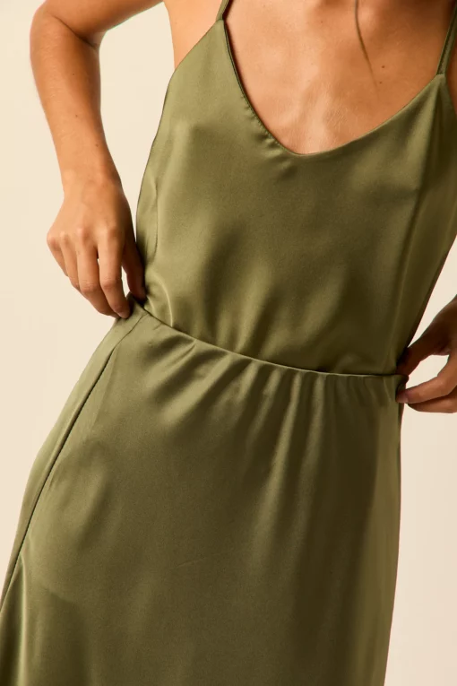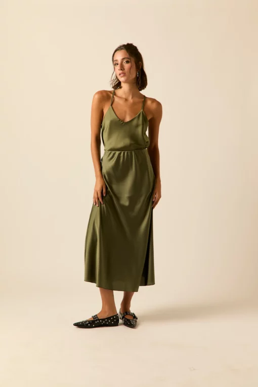Top de raso en color oliva. Cuello pico, tirante fino y diseño recto y fluido.