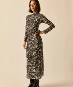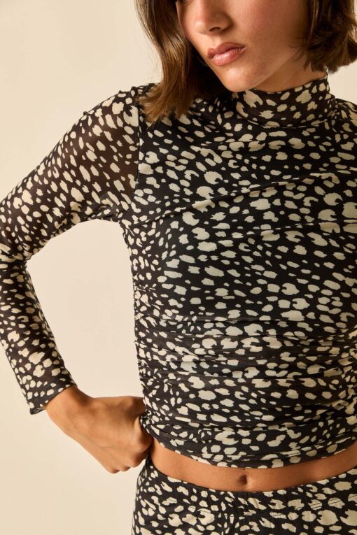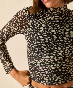 Top de tul con estampado cow print bicolor en tonos negro y beige. Cuello alto, manga larga y manga semitransparente.