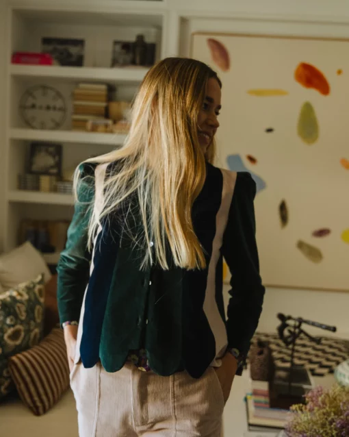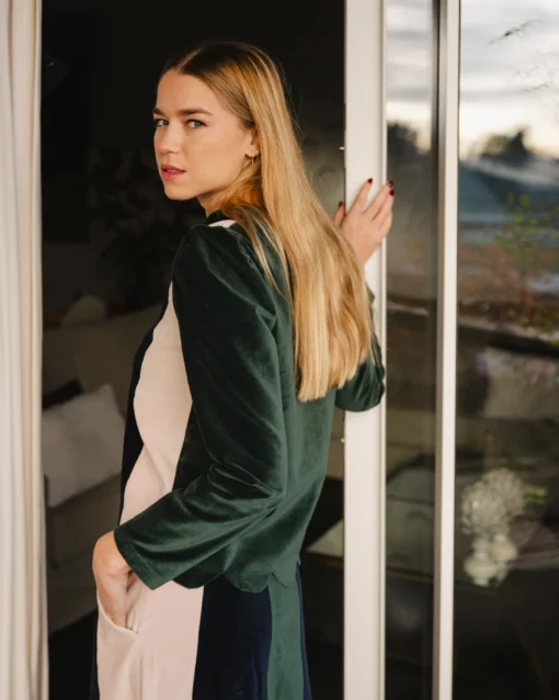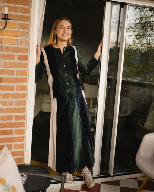 No puede ser más especial, por su terciopelo en tres colores: botella, marino y rosita, y por las ondas del bajo.