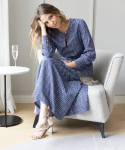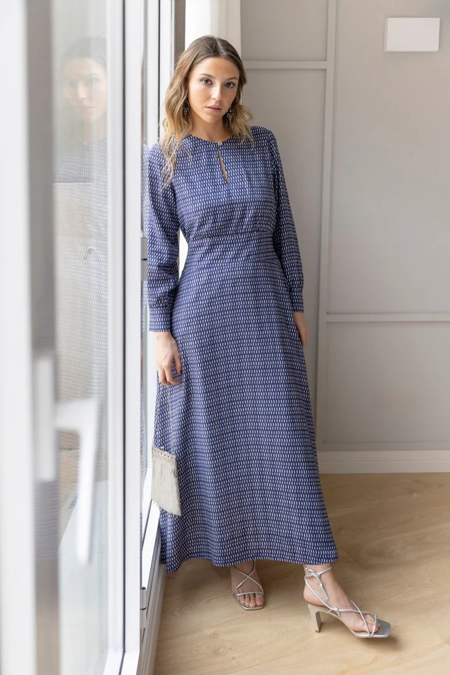Vestido largo realizado en un tejido de viscosa con una pequeña mota en dorado.